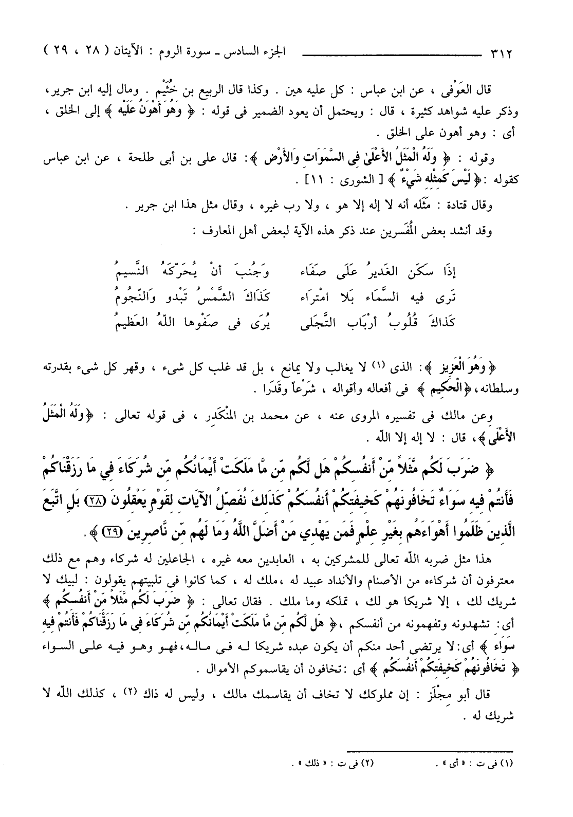 {ضَرَبَ لَكُمْ مَثَلا مِنْ أَنْفُسِكُمْ هَلْ لَكُمْ مِنْ مَا مَلَكَتْ أَيْمَانُكُمْ مِنْ شُرَكَاءَ فِي مَا رَزَقْنَاكُمْ فَأَنْتُمْ فِيهِ سَوَاءٌ تَخَافُونَهُمْ كَخِيفَتِكُمْ أَنْفُسَكُمْ كَذَلِكَ نُفَصِّلُ الآيَاتِ لِقَوْمٍ يَعْقِلُونَ (28) بَلِ اتَّبَعَ الَّذِينَ ظَلَمُوا أَهْوَاءَهُمْ بِغَيْرِ عِلْمٍ فَمَنْ يَهْدِي مَنْ أَضَلَّ اللَّهُ وَمَا لَهُمْ مِنْ نَاصِرِينَ (29) }