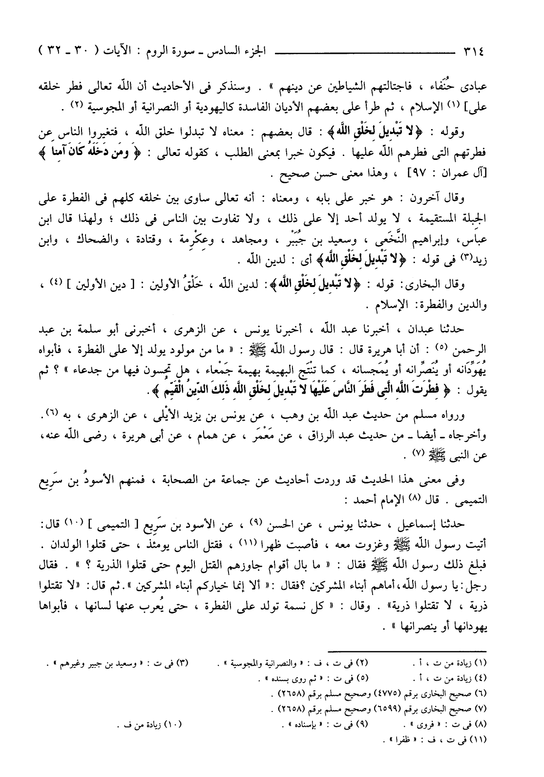 عِبَادِي حُنَفاء، فَاجْتَالَتْهُمُ الشَّيَاطِينُ عَنْ دِينِهِمْ". وَسَنَذْكُرُ فِي الْأَحَادِيثِ أَنَّ اللَّهَ تَعَالَى فَطَرَ خَلْقَهُ عَلَى] (1) الْإِسْلَامِ، ثُمَّ طَرَأَ عَلَى بَعْضِهِمُ الْأَدْيَانُ الْفَاسِدَةُ كَالْيَهُودِيَّةِ أَوِ النَّصْرَانِيَّةِ أَوِ الْمَجُوسِيَّةِ (2) .
