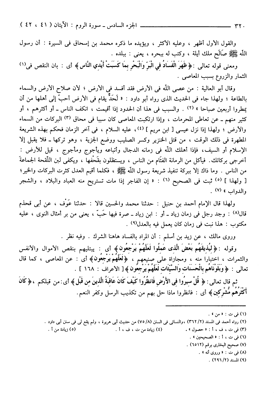 وَمَعْنَى قَوْلِهِ تَعَالَى: {ظَهَرَ الْفَسَادُ فِي الْبَرِّ وَالْبَحْرِ بِمَا كَسَبَتْ أَيْدِي النَّاسِ} أَيْ: بَانَ النَّقْصُ فِي (1) الثِّمَارِ وَالزُّرُوعِ بِسَبَبِ الْمَعَاصِي.
