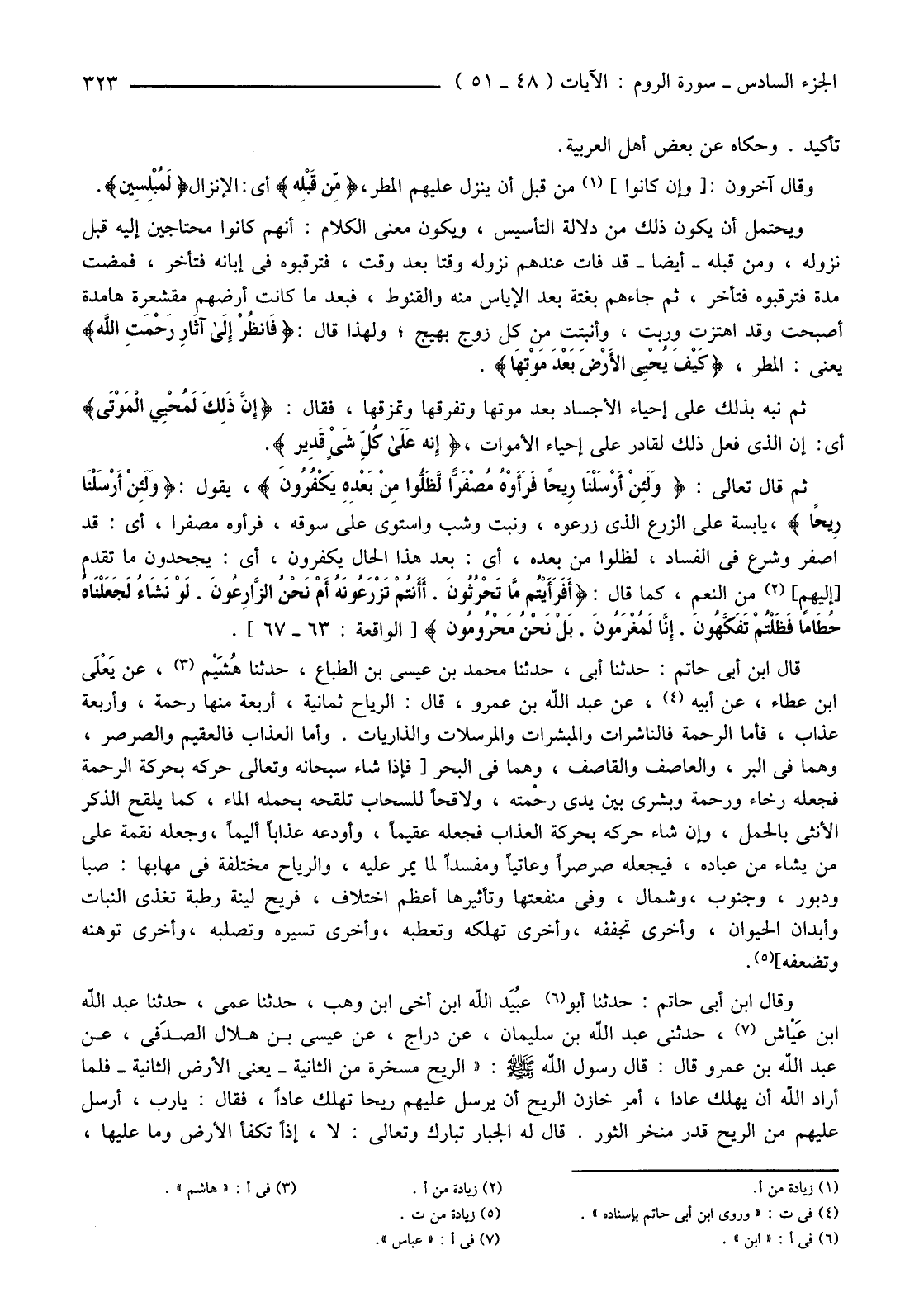 قَالَ ابْنُ أَبِي حَاتِمٍ: حَدَّثَنَا أَبِي، حَدَّثَنَا محمد بن عيسى بن الطباع، حَدَّثَنَا هُشَيْم (3) ، عَنْ يَعْلَى بْنِ عَطَاءٍ، عَنِ أَبِيهِ (4) عَنْ عَبْدِ اللَّهِ بْنِ عَمْرٍو، قَالَ: الرِّيَاحُ ثَمَانِيَةٌ، أَرْبَعَةٌ مِنْهَا رَحْمَةٌ، وَأَرْبَعَةٌ عَذَابٌ، فَأَمَّا الرَّحْمَةُ فَالنَّاشِرَاتُ وَالْمُبَشِّرَاتُ وَالْمُرْسَلَاتُ وَالذَّارِيَاتُ. وَأَمَّا الْعَذَابُ فَالْعَقِيمُ وَالصَّرْصَرُ، وَهُمَا فِي الْبَرِّ، وَالْعَاصِفُ وَالْقَاصِفُ، وَهُمَا فِي الْبَحْرِ [فَإِذَا شَاءَ سُبْحَانَهُ وَتَعَالَى حَرَّكَهُ بِحَرَكَةِ الرَّحْمَةِ فَجَعَلَهُ رَخَاءً وَرَحْمَةً وَبُشْرَى بَيْنَ يَدَيْ رحْمته، وَلَاقِحًا لِلسَّحَابِ تُلَقِّحُهُ بِحَمْلِهِ الْمَاءَ، كَمَا يُلَقِّحُ الذَّكَرُ الْأُنْثَى بِالْحَمْلِ، وَإِنْ شَاءَ حَرَّكَهُ بِحَرَكَةِ الْعَذَابِ فَجَعَلَهُ عَقِيمًا، وَأَوْدَعَهُ عَذَابًا أَلِيمًا، وَجَعْلَهُ نِقْمَةً عَلَى مَنْ يَشَاءُ مِنْ عِبَادِهِ، فَيَجْعَلُهُ صَرْصَرًا وَعَاتِيًا وَمُفْسِدًا لِمَا يَمُرُّ عَلَيْهِ، وَالرِّيَاحُ مُخْتَلِفَةٌ فِي مَهَابِّهَا: صَبًا وَدَبُورٌ، وَجَنُوبٌ، وَشِمَالٌ، وَفِي مَنْفَعَتِهَا وَتَأْثِيرِهَا أَعْظَمَ اخْتِلَافِ، فَرِيحٌ لَيِّنَةٌ رَطْبَةٌ تُغَذِّي النَّبَاتَ وَأَبْدَانَ الْحَيَوَانِ، وَأُخْرَى تُجَفِّفُهُ، وَأُخْرَى تُهْلِكُهُ وَتُعْطِبُهُ، وَأُخْرَى تُسَيِّرُهُ وَتَصْلُبُهُ، وَأُخْرَى تُوهِنُهُ وَتُضْعِفُهُ] (5) .