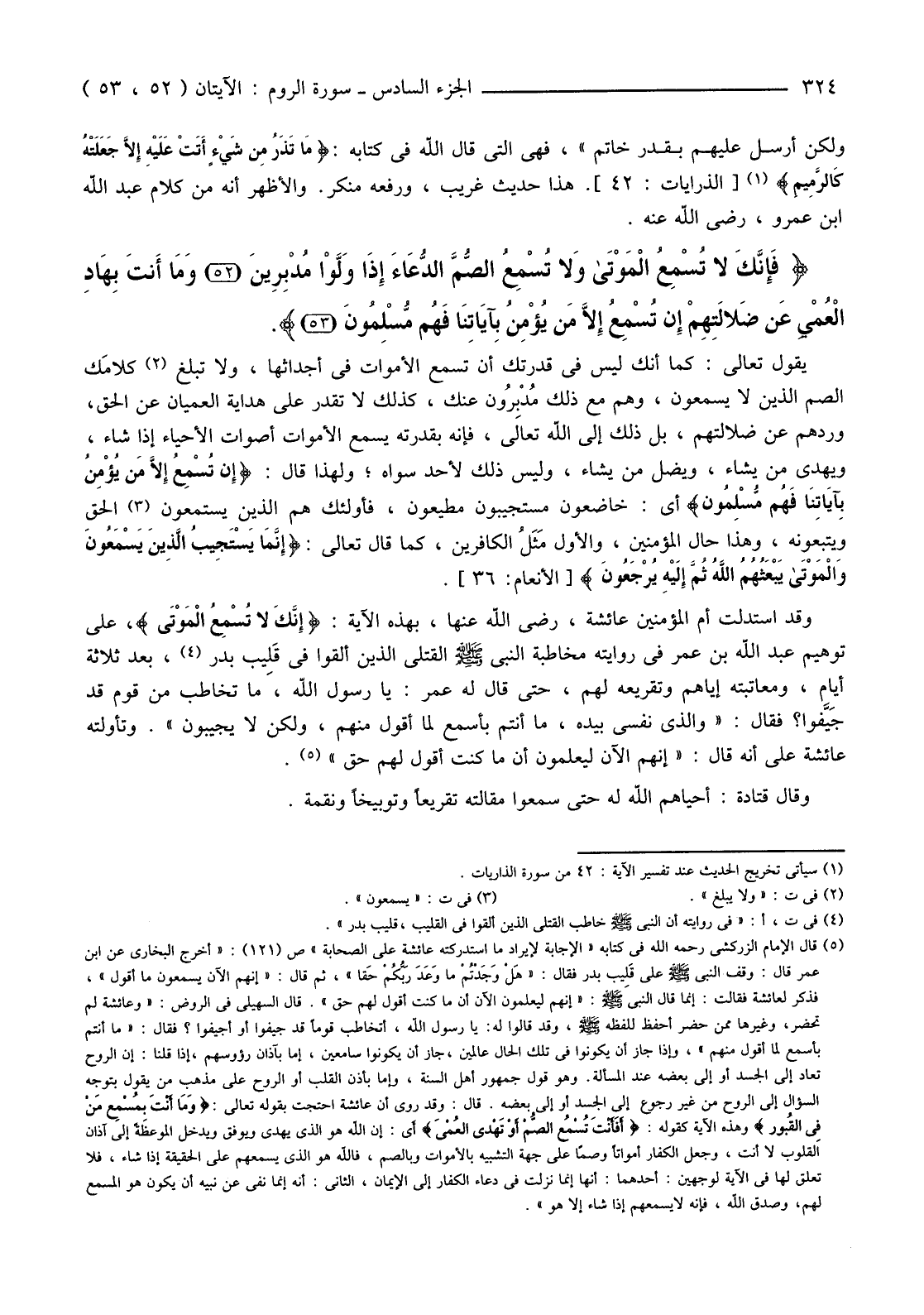 وَقَدِ اسْتَدَلَّتْ أُمُّ الْمُؤْمِنِينَ عَائِشَةُ، رَضِيَ اللَّهُ عَنْهَا، بِهَذِهِ الْآيَةِ: {إِنَّكَ لَا تُسْمِعُ الْمَوْتَى} ، عَلَى تَوْهِيمِ عَبْدِ اللَّهِ بْنِ عُمَرَ فِي رِوَايَتِهِ مُخَاطَبَةَ النَّبِيِّ صَلَّى اللَّهُ عَلَيْهِ وَسَلَّمَ الْقَتْلَى الَّذِينَ أُلْقُوا فِي قَلِيب بَدْرٍ (4) ، بَعْدَ ثَلَاثَةِ أَيَّامٍ، وَمُعَاتَبَتَهُ إِيَّاهُمْ وَتَقْرِيعَهُ لَهُمْ، حَتَّى قَالَ لَهُ عُمَرُ: يَا رَسُولَ اللَّهِ، مَا تُخَاطِبُ مِنْ قَوْمٍ قَدْ جَيَّفوا؟ فَقَالَ: "وَالَّذِي نَفْسِي بِيَدِهِ، مَا أَنْتُمْ بِأَسْمَعَ لِمَا أَقُولُ مِنْهُمْ، وَلَكِنْ لَا يُجِيبُونَ". وَتَأَوَّلَتْهُ عَائِشَةُ عَلَى أَنَّهُ قَالَ: "إِنَّهُمُ الْآنَ لَيَعْلَمُونِ أَنَّ مَا كُنْتُ أَقُولُ لَهُمْ حَقٌّ" (5) .