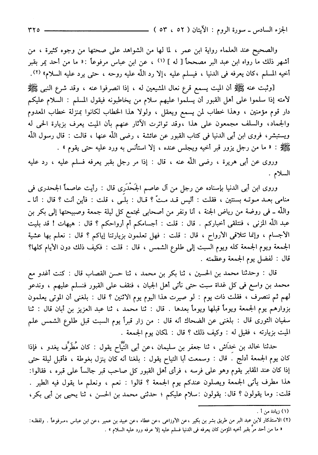قَالَ: وَحَدَّثَنَا مُحَمَّدُ بْنُ الْحُسَيْنِ، ثَنَا بَكْرُ بْنُ مُحَمَّدٍ، ثَنَا حَسَنٌ الْقَصَّابُ قَالَ: كُنْتُ أَغْدُو مَعَ مُحَمَّدِ بْنِ وَاسْعٍ فِي كُلِّ غَدَاةِ سَبْتٍ حَتَّى نَأْتِيَ أَهْلَ الْجَبَّانِ، فَنَقِفُ عَلَى الْقُبُورِ فَنُسَلِّمُ عَلَيْهِمْ، وَنَدْعُو لَهُمْ ثُمَّ نَنْصَرِفُ، فَقُلْتُ ذَاتَ يَوْمٍ: لَوْ صَيَّرْتُ هَذَا الْيَوْمَ يَوْمَ الِاثْنَيْنِ؟ قَالَ: بَلَغَنِي أَنَّ الْمَوْتَى يَعْلَمُونَ بِزُوَّارِهِمْ يَوْمَ الْجُمْعَةِ وَيَوْمًا قَبْلَهَا وَيَوْمًا بَعْدَهَا. قَالَ: ثَنَا مُحَمَّدٌ، ثَنَا عَبْدُ الْعَزِيزِ بْنُ أَبَانٍ قَالَ: ثَنَا سُفْيَانُ الثَّوْرِيُّ قَالَ: بَلَغَنِي عَنِ الضَّحَّاكِ أَنَّهُ قَالَ: مَنْ زَارَ قَبْرًا يَوْمَ السَّبْتِ قَبْلَ طُلُوعِ الشَّمْسِ عَلِمَ الْمَيِّتُ بِزِيَارَتِهِ، فَقِيلَ لَهُ: وَكَيْفَ ذَلِكَ؟ قَالَ: لِمَكَانِ يَوْمِ الْجُمُعَةِ.