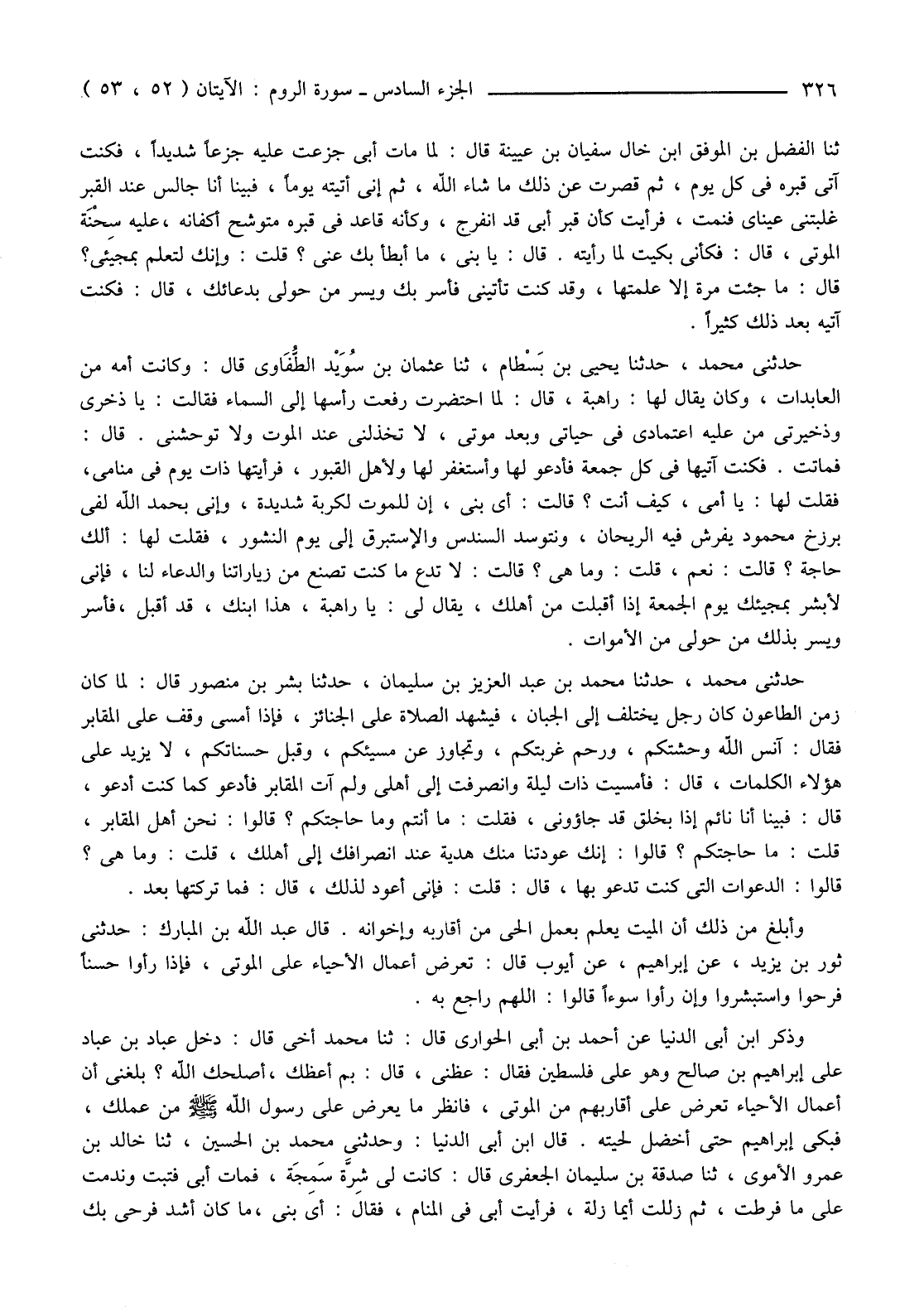 ثَنَا الْفَضْلُ بْنُ الْمُوَفَّقِ ابْنُ خَالِ سُفْيَانَ بْنِ عُيَيْنَةَ قَالَ: لَمَّا مَاتَ أَبِي جَزِعْتُ عَلَيْهِ جَزَعًا شَدِيدًا، فَكُنْتُ آتِي قَبْرَهُ فِي كُلِّ يَوْمٍ، ثُمَّ قَصَّرْتُ عَنْ ذَلِكَ مَا شَاءَ اللَّهُ، ثُمَّ إِنِّي أَتَيْتُهُ يَوْمًا، فَبَيْنَا أَنَا جَالِسٌ عِنْدَ الْقَبْرِ غَلَبَتْنِي عَيْنَايَ فَنِمْتُ، فَرَأَيْتُ كَأَنَّ قَبْرَ أَبِي قَدِ انْفَرَجَ، وَكَأَنَّهُ قَاعِدٌ فِي قَبْرِهِ مُتَوَشِّحٌ أَكْفَانَهُ، عَلَيْهِ سِحْنَة الْمَوْتَى، قَالَ: فَكَأَنِّي بَكَيْتُ لَمَّا رَأَيْتُهُ. قَالَ: يَا بُنَيَّ، مَا أَبْطَأَ بِكَ عَنِّي؟ قُلْتُ: وَإِنَّكَ لَتَعْلَمُ بِمَجِيئِي؟ قَالَ: مَا جِئْتَ مَرَّةً إِلَّا عَلِمْتُهَا، وَقَدْ كُنْتَ تَأْتِينِي فَأُسَرُّ بِكَ وَيُسَرُّ مِنْ حَوْلِي بِدُعَائِكَ، قَالَ: فَكُنْتُ آتِيهِ بَعْدَ ذَلِكَ كَثِيرًا.