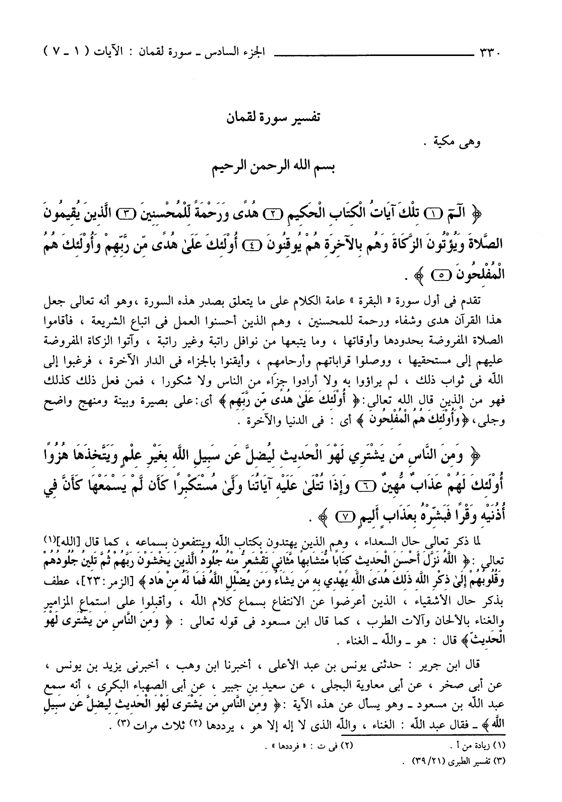 قَالَ ابْنُ جَرِيرٍ: حَدَّثَنِي يُونُسُ بْنُ عَبْدِ الْأَعْلَى، أَخْبَرَنَا ابْنُ وَهْبٍ، أَخْبَرَنِي يَزِيدُ بْنُ يُونُسَ، عَنْ أَبِي صَخْرٍ، عَنْ أَبِي مُعَاوِيَةَ الْبَجَلِيِّ، عَنْ سَعِيدِ بْنِ جُبَيْرٍ، عَنِ أَبِي الصَّهْبَاءِ الْبَكْرِيِّ، أَنَّهُ سَمِعَ عَبْدَ اللَّهِ بْنَ مَسْعُودٍ -وَهُوَ يَسْأَلُ عَنْ هَذِهِ الْآيَةِ: {وَمِنَ النَّاسِ مَنْ يَشْتَرِي لَهْوَ الْحَدِيثِ لِيُضِلَّ عَنْ سَبِيلِ اللَّهِ} -فَقَالَ عَبْدُ اللَّهِ: الْغِنَاءُ، وَاللَّهِ الَّذِي لَا إِلَهَ إلا هو، يرددها (2) ثلاث مرات (3) .