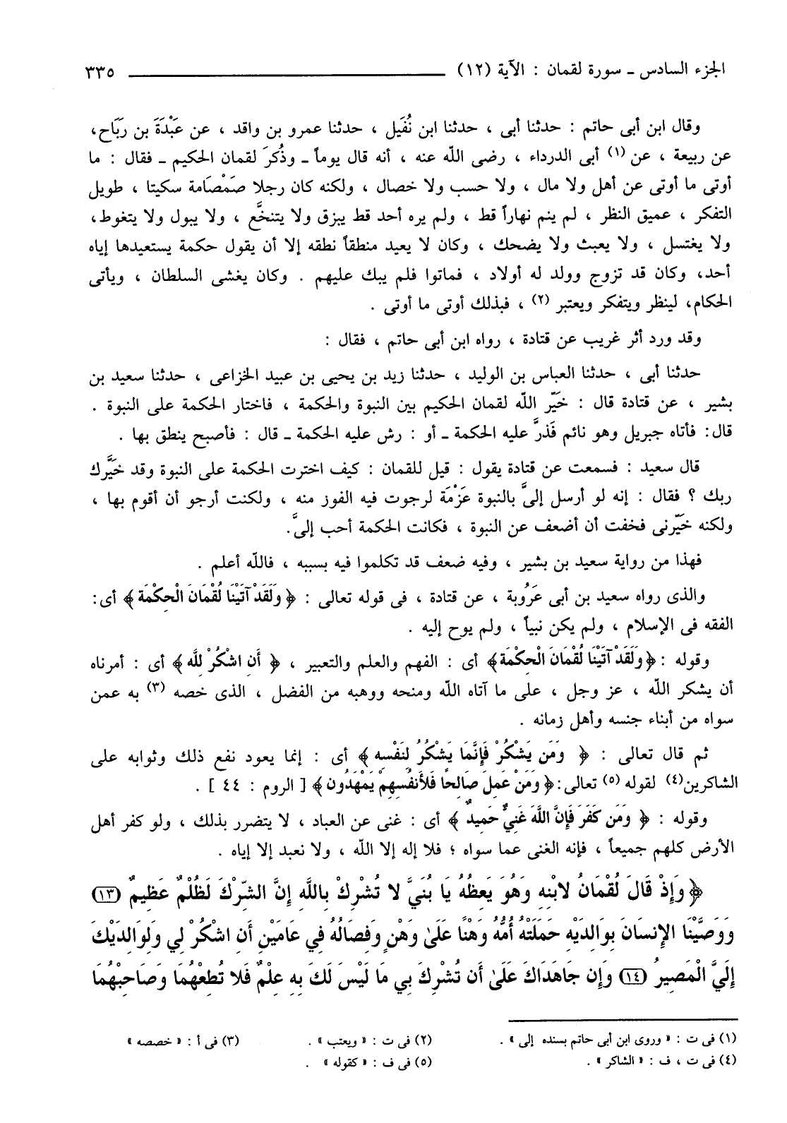 وَالَّذِي رَوَاهُ سَعِيدُ بْنُ أَبِي عَرُوبة، عَنْ قَتَادَةَ، فِي قَوْلِهِ تَعَالَى: {وَلَقَدْ آتَيْنَا لُقْمَانَ الْحِكْمَةَ} أَيِ: الْفِقْهُ فِي الْإِسْلَامِ، وَلَمْ يَكُنْ نَبِيًّا، وَلَمْ يُوحَ إِلَيْهِ.