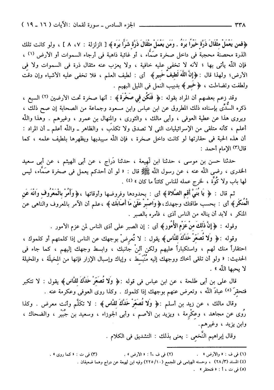 وَقَدْ زَعَمَ بَعْضُهُمْ أَنَّ الْمُرَادَ بِقَوْلِهِ: {فَتَكُنْ فِي صَخْرَةٍ} أَنَّهَا صَخْرَةٌ تَحْتَ الْأَرْضِينَ (2) السَّبْعِ، ذَكَرَهُ السُّدِّي بِإِسْنَادِهِ ذَلِكَ الْمَطْرُوقِ عَنِ ابْنِ عَبَّاسٍ وَابْنِ مَسْعُودٍ وَجَمَاعَةٍ مِنَ الصَّحَابَةِ إِنْ صَحَّ ذَلِكَ، وَيُرْوَى هَذَا عَنْ عَطِيَّةَ الْعَوْفِيِّ، وَأَبِي مَالِكٍ، وَالثَّوْرِيِّ، والمِنهال بْنِ عَمْرٍو، وَغَيْرِهِمْ. وَهَذَا وَاللَّهُ أَعْلَمُ، كَأَنَّهُ مُتَلَقًّى مِنَ الْإِسْرَائِيلِيَّاتِ الَّتِي لَا تُصَدَّقُ، وَلَا تَكْذَّبُ، وَالظَّاهِرُ -وَاللَّهُ أَعْلَمُ -أَنَّ الْمُرَادَ: أَنَّ هَذِهِ الْحَبَّةَ فِي حَقَارَتِهَا لَوْ كَانَتْ دَاخِلَ صَخْرَةٍ، فَإِنَّ اللَّهَ سَيُبْدِيهَا وَيُظْهِرُهَا بِلَطِيفِ عِلْمِهِ، كَمَا قَالَ (3) الْإِمَامُ أَحْمَدُ:
