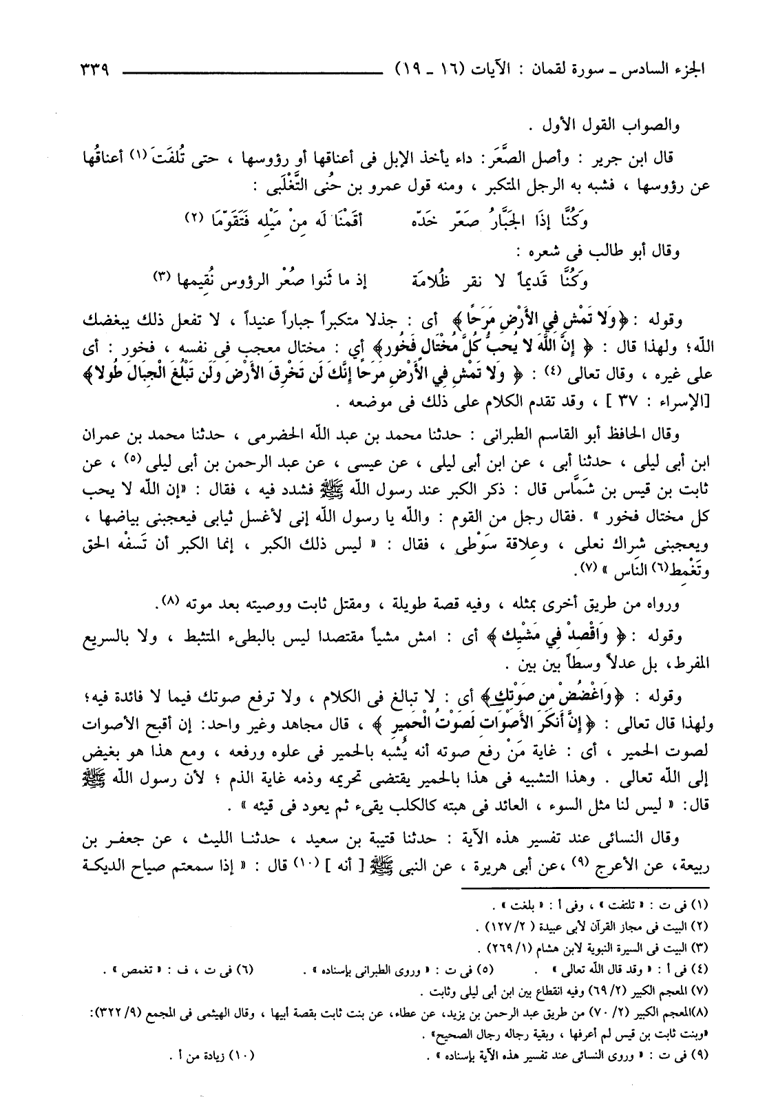 قَالَ ابْنُ جَرِيرٍ: وَأَصْلُ الصَّعَر: دَاءٌ يَأْخُذُ الْإِبِلَ فِي أَعْنَاقِهَا أَوْ رُؤُوسِهَا، حَتَّى تُلفَتَ (1) أعناقُها عَنْ رُؤُوسِهَا، فَشُبِّهَ بِهِ الرَّجُلُ الْمُتَكَبِّرُ، وَمِنْهُ قَوْلُ عَمْرِو بْنِ حُني التَّغْلبي: