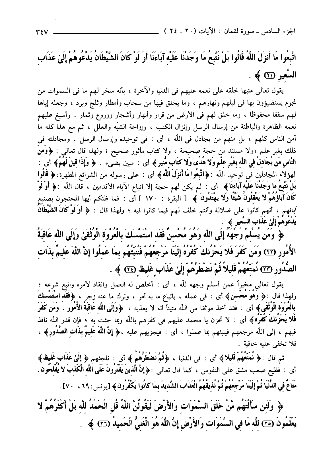 {أَلَمْ تَرَوْا أَنَّ اللَّهَ سَخَّرَ لَكُمْ مَا فِي السَّمَوَاتِ وَمَا فِي الأرْضِ وَأَسْبَغَ عَلَيْكُمْ نِعَمَهُ ظَاهِرَةً وَبَاطِنَةً وَمِنَ النَّاسِ مَنْ يُجَادِلُ فِي اللَّهِ بِغَيْرِ عِلْمٍ وَلا هُدًى وَلا كِتَابٍ مُنِيرٍ (20) وَإِذَا قِيلَ لَهُمُ اتَّبِعُوا مَا أَنزلَ اللَّهُ قَالُوا بَلْ نَتَّبِعُ مَا وَجَدْنَا عَلَيْهِ آبَاءَنَا أَوَلَوْ كَانَ الشَّيْطَانُ يَدْعُوهُمْ إِلَى عَذَابِ السَّعِيرِ (21) } .