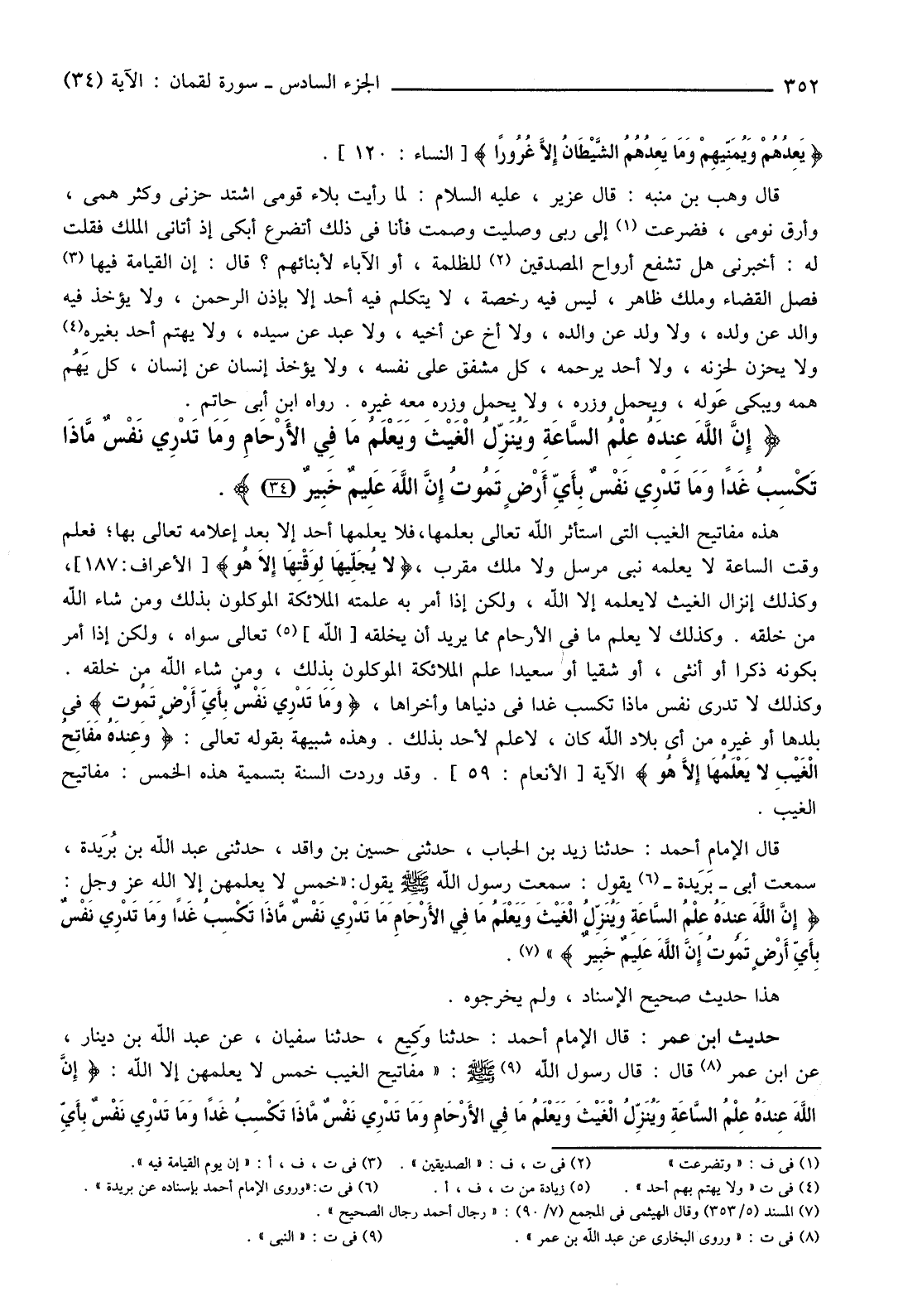 حَدِيثُ ابْنِ عُمَرَ: قَالَ الْإِمَامُ أَحْمَدُ: حَدَّثَنَا وَكِيع، حَدَّثَنَا سُفْيَانُ، عَنْ عَبْدِ اللَّهِ بْنِ دِينَارٍ، عَنِ ابْنِ عُمَرَ (8) قَالَ: قَالَ رَسُولُ اللَّهِ صَلَّى اللَّهُ عَلَيْهِ وَسَلَّمَ (9) مَفَاتِيحُ الْغَيْبِ خَمْسٌ لَا يَعْلَمُهُنَّ إِلَّا اللَّهُ: {إِنَّ اللَّهَ عِنْدَهُ عِلْمُ السَّاعَةِ وَيُنزلُ الْغَيْثَ وَيَعْلَمُ مَا فِي الأرْحَامِ وَمَا تَدْرِي نَفْسٌ مَاذَا تَكْسِبُ غَدًا وَمَا تَدْرِي نَفْسٌ بِأَيِّ أَرْضٍ تَمُوتُ إِنَّ اللَّهَ عَلِيمٌ خَبِيرٌ} .