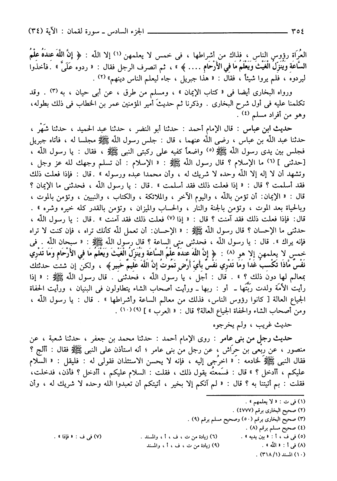 حَدِيثُ ابْنِ عَبَّاسٍ: قَالَ الْإِمَامُ أَحْمَدُ: حَدَّثَنَا أَبُو النَّضْرِ، حَدَّثَنَا عَبْدُ الْحَمِيدِ، حَدَّثَنَا شَهْر، حَدَّثَنَا عَبْدِ اللَّهِ بْنِ عَبَّاسٍ، رَضِيَ اللَّهُ عَنْهُمَا، قَالَ: جَلَسَ رَسُولُ اللَّهِ صَلَّى اللَّهُ عَلَيْهِ وَسَلَّمَ مَجْلِسًا لَهُ، فَأَتَاهُ جِبْرِيلُ فَجَلَسَ بَيْنَ يَدَيْ رَسُولِ اللَّهِ صَلَّى اللَّهُ عَلَيْهِ وَسَلَّمَ (5) وَاضِعًا كَفَّيْهِ عَلَى رُكْبَتِي النَّبِيِّ صَلَّى اللَّهُ عَلَيْهِ وَسَلَّمَ، فَقَالَ: يَا رَسُولَ اللَّهِ، [حَدِّثْنِي] (6) مَا الْإِسْلَامُ؟ قَالَ رَسُولُ اللَّهِ صَلَّى اللَّهُ عَلَيْهِ وَسَلَّمَ: الْإِسْلَامُ أَنْ تُسْلِمَ وَجْهَكَ لِلَّهِ عَزَّ وَجَلَّ، وَتَشْهَدَ أَنْ لَا إِلَهَ إِلَّا اللَّهُ وَحْدَهُ لَا شَرِيكَ لَهُ، وَأَنَّ مُحَمَّدًا عَبْدُهُ وَرَسُولُهُ". قَالَ: فَإِذَا فَعَلْتُ ذَلِكَ فَقَدْ أَسْلَمْتُ؟ قَالَ: "إِذَا فَعَلْتَ ذَلِكَ فَقَدْ أَسْلَمْتَ". قَالَ: يَا رَسُولَ اللَّهِ، فحدِّثني مَا الْإِيمَانُ؟ قَالَ: "الْإِيمَانُ: أَنْ تُؤْمِنَ بِاللَّهِ، وَالْيَوْمِ الْآخِرِ، وَالْمَلَائِكَةِ، وَالْكِتَابِ، وَالنَّبِيِّينَ، وَتُؤْمِنَ بِالْمَوْتِ، وَبِالْحَيَاةِ بَعْدَ الْمَوْتِ، وَتُؤْمِنَ بِالْجَنَّةِ وَالنَّارِ، وَالْحِسَابِ وَالْمِيزَانِ، وَتُؤْمِنَ بِالْقَدَرِ كُلِّهِ خَيْرِهِ وَشَرِّهِ". قَالَ: فَإِذَا فَعَلْتُ ذَلِكَ فَقَدْ آمَنْتُ؟ قَالَ: "إِذَا (7) فَعَلْتَ ذَلِكَ فَقَدْ آمَنْتَ". قَالَ: يَا رَسُولَ اللَّهِ، حَدِّثْنِي مَا الْإِحْسَانُ؟ قَالَ رَسُولُ اللَّهِ صَلَّى اللَّهُ عَلَيْهِ وَسَلَّمَ: "الْإِحْسَانُ أَنْ تَعْمَلَ لِلَّهِ كَأَنَّكَ تَرَاهُ، فَإِنْ كُنْتَ لَا تَرَاهُ فَإِنَّهُ يَرَاكَ". قَالَ: يَا رَسُولَ اللَّهِ، فَحَدِّثْنِي مَتَى السَّاعَةُ؟ قَالَ رَسُولُ اللَّهِ صَلَّى اللَّهُ عَلَيْهِ وَسَلَّمَ: "سُبْحَانَ اللَّهِ. فِي خَمْسٍ لَا يَعْلَمُهُنَّ إِلَّا هُوَ: (8) {إِنَّ اللَّهَ عِنْدَهُ عِلْمُ السَّاعَةِ وَيُنزلُ الْغَيْثَ وَيَعْلَمُ مَا فِي الأرْحَامِ وَمَا تَدْرِي نَفْسٌ مَاذَا تَكْسِبُ غَدًا وَمَا تَدْرِي نَفْسٌ بِأَيِّ أَرْضٍ تَمُوتُ إِنَّ اللَّهَ عَلِيمٌ خَبِيرٌ} ، وَلَكِنْ إِنْ شِئْتَ حَدَّثْتُكَ بِمَعَالِمَ لَهَا دُونَ ذَلِكَ؟ ". قَالَ: أَجَلْ، يَا رَسُولَ اللَّهِ، فَحَدِّثْنِي. قَالَ رَسُولُ اللَّهِ صَلَّى اللَّهُ عَلَيْهِ وَسَلَّمَ: "إِذَا رَأَيْتَ الأمَة وَلَدَتْ رَبَّتَها -أَوْ: رَبَّهَا -وَرَأَيْتَ أَصْحَابَ الشَّاءِ يَتَطَاوَلُونَ فِي الْبُنْيَانِ، وَرَأَيْتَ الْحُفَاةَ الْجِيَاعَ الْعَالَةَ [كَانُوا رُؤُوسَ النَّاسِ، فَذَلِكَ مِنْ مَعَالِمِ السَّاعَةِ وَأَشْرَاطِهَا". قَالَ: يَا رَسُولَ اللَّهِ، ومَنْ أَصْحَابُ الشَّاءِ وَالْحُفَاةِ الْجِيَاعِ الْعَالَةِ؟ قَالَ: "الْعَرَبُ"] (9) (10) .