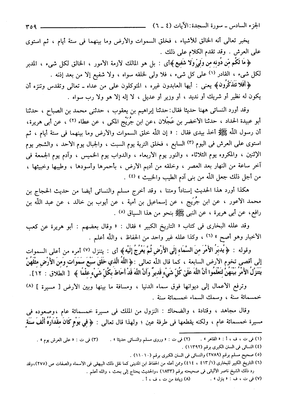 {اللَّهُ الَّذِي خَلَقَ السَّمَوَاتِ وَالأرْضَ وَمَا بَيْنَهُمَا فِي سِتَّةِ أَيَّامٍ ثُمَّ اسْتَوَى عَلَى الْعَرْشِ مَا لَكُمْ مِنْ دُونِهِ مِنْ وَلِيٍّ وَلا شَفِيعٍ أَفَلا تَتَذَكَّرُونَ (4) يُدَبِّرُ الأمْرَ مِنَ السَّمَاءِ إِلَى الأرْضِ ثُمَّ يَعْرُجُ إِلَيْهِ فِي يَوْمٍ كَانَ مِقْدَارُهُ أَلْفَ سَنَةٍ مِمَّا تَعُدُّونَ (5) ذَلِكَ عَالِمُ الْغَيْبِ وَالشَّهَادَةِ الْعَزِيزُ الرَّحِيمُ (6) } .