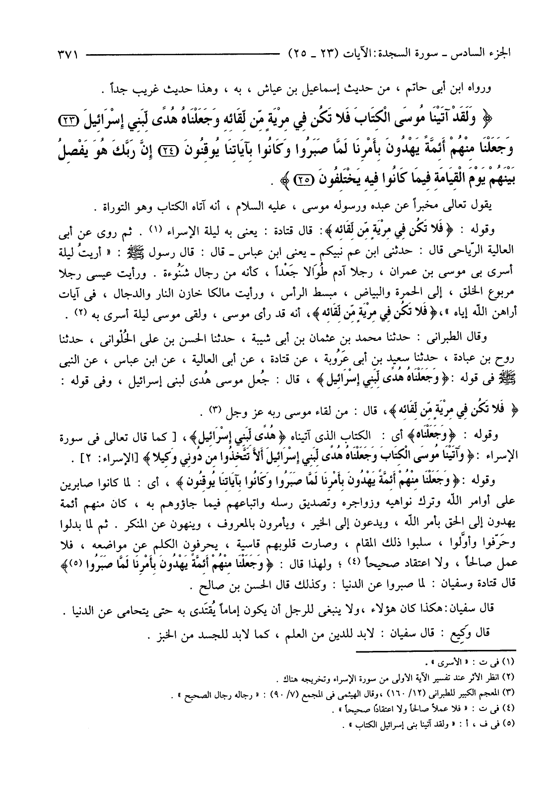{وَلَقَدْ آتَيْنَا مُوسَى الْكِتَابَ فَلا تَكُنْ فِي مِرْيَةٍ مِنْ لِقَائِهِ وَجَعَلْنَاهُ هُدًى لِبَنِي إِسْرَائِيلَ (23) وَجَعَلْنَا مِنْهُمْ أَئِمَّةً يَهْدُونَ بِأَمْرِنَا لَمَّا صَبَرُوا وَكَانُوا بِآيَاتِنَا يُوقِنُونَ (24) إِنَّ رَبَّكَ هُوَ يَفْصِلُ بَيْنَهُمْ يَوْمَ الْقِيَامَةِ فِيمَا كَانُوا فِيهِ يَخْتَلِفُونَ (25) }
