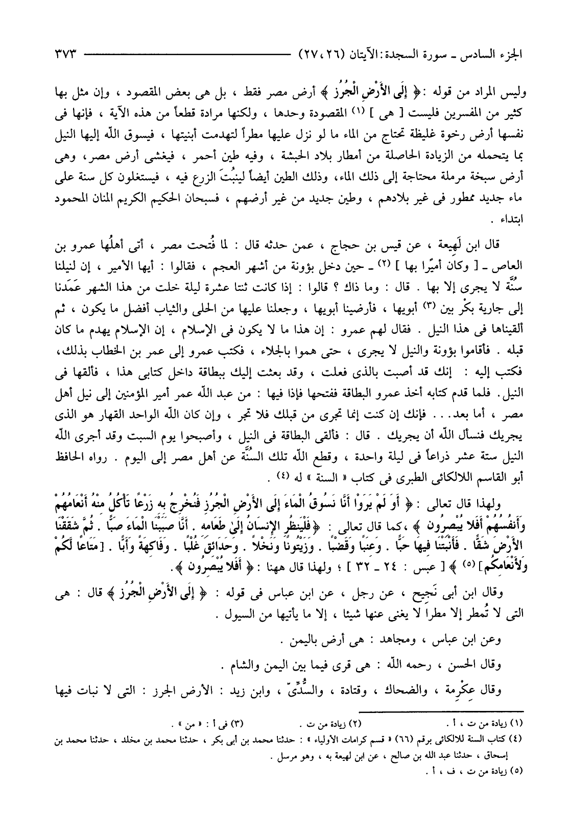 وَلَيْسَ الْمُرَادُ مِنْ قَوْلِهِ: {إِلَى الأرْضِ الْجُرُزِ} أَرْضَ مِصْرَ فَقَطْ، بَلْ هِيَ بَعْضُ الْمَقْصُودِ، وَإِنْ مَثَّلَ بِهَا كَثِيرٌ مِنَ الْمُفَسِّرِينَ فَلَيْسَتْ [هِيَ] (1) الْمَقْصُودَةُ وَحْدَهَا، وَلَكِنَّهَا مُرَادَّةٌ قَطْعًا مِنْ هَذِهِ الْآيَةِ، فَإِنَّهَا فِي نَفْسِهَا أَرْضٌ رَخْوَةٌ غَلِيظَةٌ تَحْتَاجُ مِنَ الْمَاءِ مَا لَوْ نَزَّلَ عَلَيْهَا مَطَرًا لَتَهَدَّمَتْ أَبْنِيَتُهَا، فَيَسُوقُ اللَّهُ إِلَيْهَا النَّيْلَ بِمَا يَتَحَمَّلُهُ مِنَ الزِّيَادَةِ الْحَاصِلَةِ مِنْ أَمْطَارِ بِلَادِ الْحَبَشَةِ، وَفِيهِ طِينٌ أَحْمَرُ، فَيَغْشَى أَرْضَ مِصْرَ، وَهِيَ أَرْضٌ سَبَخَةٌ مُرْمِلَةٌ مُحْتَاجَةٌ إِلَى ذَلِكَ الْمَاءِ، وَذَلِكَ الطِّينِ أَيْضًا لينبُتَ الزَّرْعُ فِيهِ، فَيَسْتَغِلُّونَ كُلَّ سَنَةٍ عَلَى مَاءٍ جَدِيدٍ مَمْطُورٍ فِي غَيْرِ بِلَادِهِمْ، وَطِينٍ جَدِيدٍ مِنْ غَيْرِ أَرْضِهِمْ، فَسُبْحَانَ الْحَكِيمِ الْكَرِيمِ الْمَنَّانِ الْمَحْمُودِ ابْتِدَاءً.
