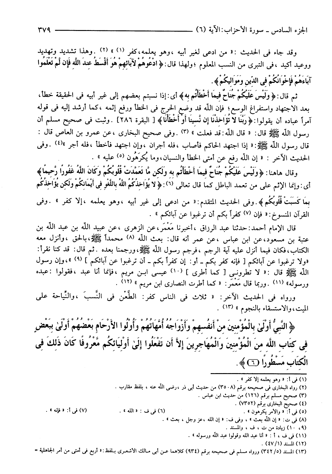 وَقَالَ هَاهُنَا: {وَلَيْسَ عَلَيْكُمْ جُنَاحٌ فِيمَا أَخْطَأْتُمْ بِهِ وَلَكِنْ مَا تَعَمَّدَتْ قُلُوبُكُمْ وَكَانَ اللَّهُ غَفُورًا رَحِيمًا} أَيْ: وَإِنَّمَا الْإِثْمُ عَلَى مَنْ تَعَمَّدَ الْبَاطِلَ كَمَا قَالَ تَعَالَى (6) : {لَا يُؤَاخِذُكُمُ اللَّهُ بِاللَّغْوِ فِي أَيْمَانِكُمْ وَلَكِنْ يُؤَاخِذُكُمْ بِمَا كَسَبَتْ قُلُوبُكُم} . وَفِي الْحَدِيثِ الْمُتَقَدِّمِ: "مَنِ ادَّعَى إِلَى غَيْرِ أَبِيهِ، وَهُوَ يَعْلَمُهُ، إِلَّا كَفَرَ". وَفِي الْقُرْآنِ الْمَنْسُوخِ: "فَإِنَّ (7) كُفْرًا بِكُمْ أَنْ تَرْغَبُوا عَنْ آبَائِكُمْ".