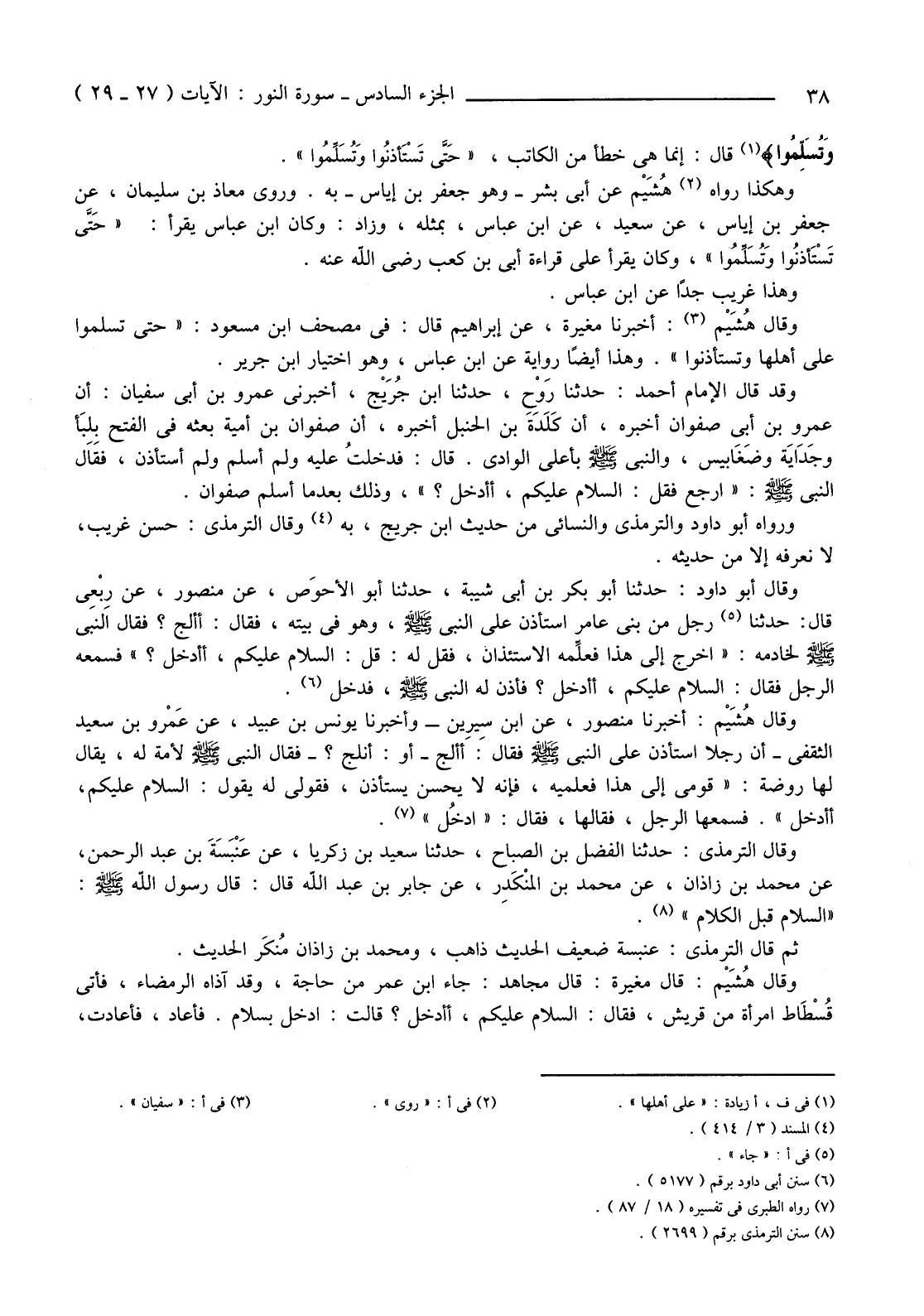 وَقَالَ هُشَيْم (2) أَخْبَرَنَا مُغِيرَةُ، عَنْ إِبْرَاهِيمَ قَالَ: فِي مُصْحَفِ ابْنِ مَسْعُودٍ: "حَتَّى تُسَلِّمُوا عَلَى أَهْلِهَا وَتَسْتَأْذِنُوا". وَهَذَا أَيْضًا رِوَايَةٌ عَنِ ابْنِ عَبَّاسٍ، وَهُوَ اخْتِيَارُ ابْنُ جَرِيرٍ.