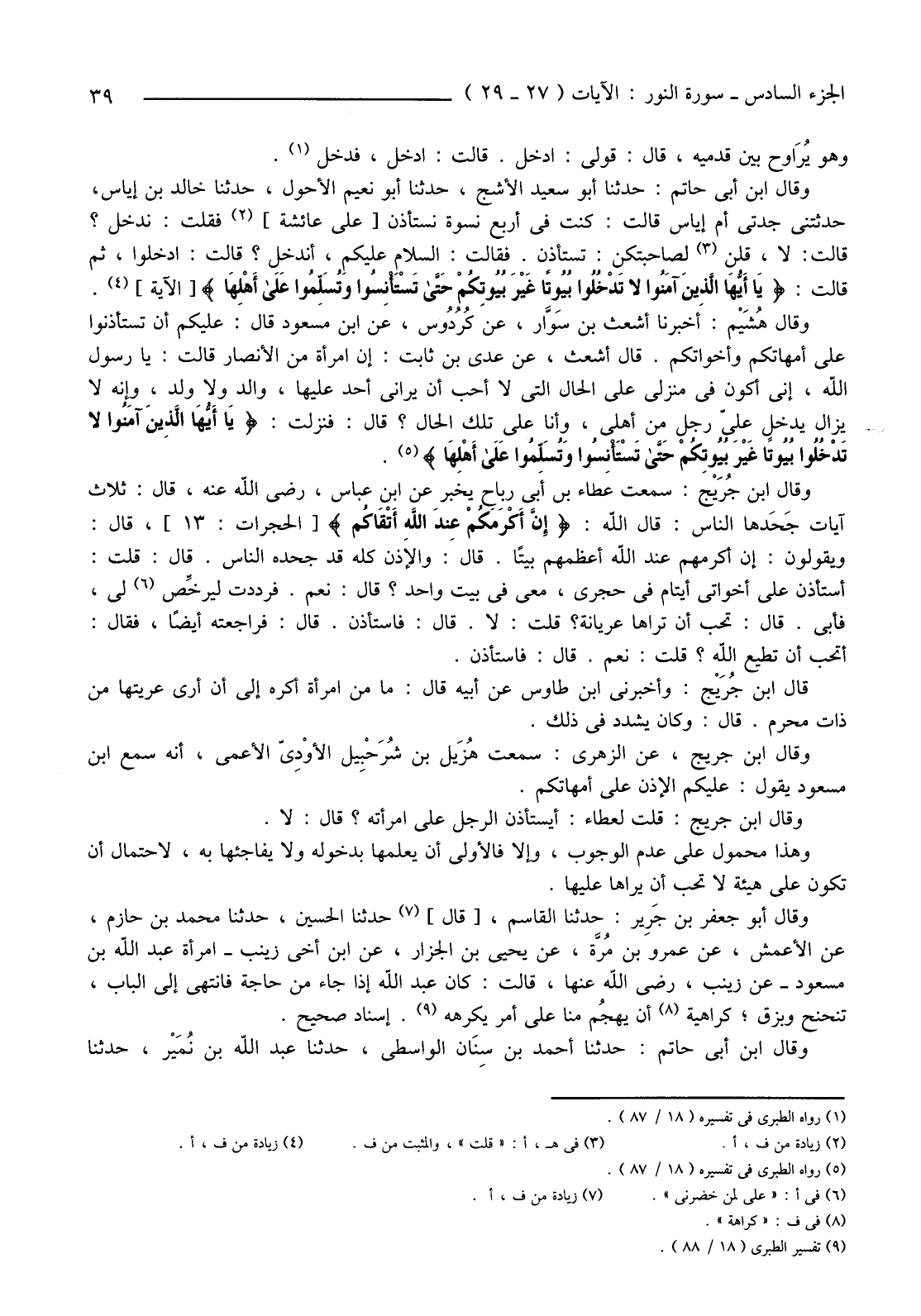 وَقَالَ هُشَيْم: أَخْبَرَنَا أَشْعَثُ بْنُ سَوَّار، عَنْ كُرْدُوس، عَنِ ابْنِ مَسْعُودٍ قَالَ: عَلَيْكُمْ أَنْ تَسْتَأْذِنُوا عَلَى أُمَّهَاتِكُمْ وَأَخَوَاتِكُمْ. قَالَ أَشْعَثُ، عَنْ عَدِيِّ بْنِ ثَابِتٍ: إِنَّ امْرَأَةً مِنَ الْأَنْصَارِ قَالَتْ: يَا رَسُولَ اللَّهِ، إِنِّي أَكُونُ فِي مَنْزِلِي عَلَى الْحَالِ الَّتِي لَا أُحِبُّ أَنْ يَرَانِي أَحَدٌ عَلَيْهَا، وَالِدٌ وَلَا وَلَدٌ، وَإِنَّهُ لَا يَزَالُ يَدْخُلُ عليَّ رَجُلٌ مِنْ أَهْلِي، وَأَنَا عَلَى تِلْكَ الْحَالِ؟ قَالَ: فَنَزَلَتْ: {يَا أَيُّهَا الَّذِينَ آمَنُوا لَا تَدْخُلُوا بُيُوتًا غَيْرَ بُيُوتِكُمْ حَتَّى تَسْتَأْنِسُوا وَتُسَلِّمُوا عَلَى أَهْلِهَا} (5) .