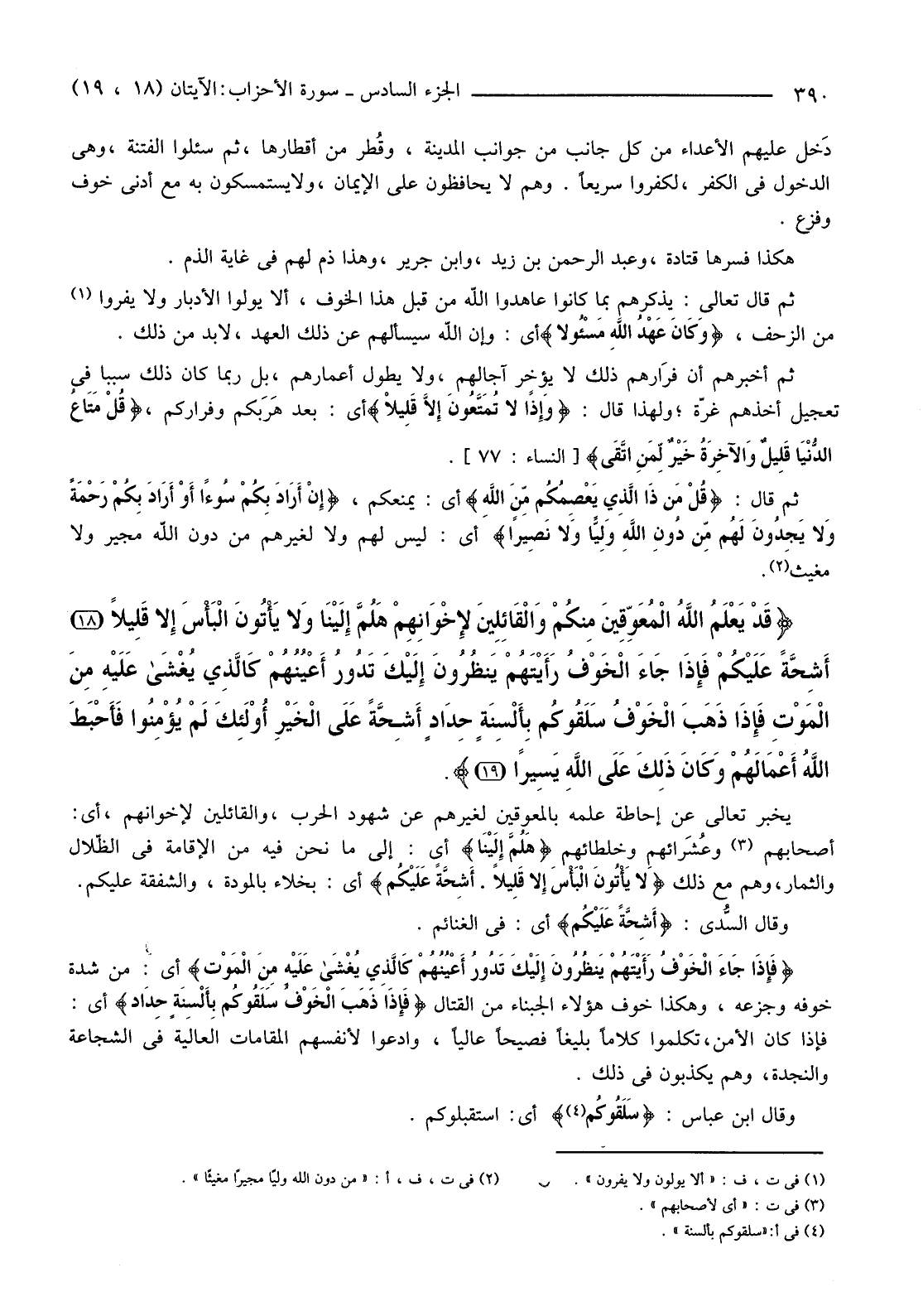{قَدْ يَعْلَمُ اللَّهُ الْمُعَوِّقِينَ مِنْكُمْ وَالْقَائِلِينَ لإخْوَانِهِمْ هَلُمَّ إِلَيْنَا وَلا يَأْتُونَ الْبَأْسَ إِلا قَلِيلا (18) أَشِحَّةً عَلَيْكُمْ فَإِذَا جَاءَ الْخَوْفُ رَأَيْتَهُمْ يَنْظُرُونَ إِلَيْكَ تَدُورُ أَعْيُنُهُمْ كَالَّذِي يُغْشَى عَلَيْهِ مِنَ الْمَوْتِ فَإِذَا ذَهَبَ الْخَوْفُ سَلَقُوكُمْ بِأَلْسِنَةٍ حِدَادٍ أَشِحَّةً عَلَى الْخَيْرِ أُولَئِكَ لَمْ يُؤْمِنُوا فَأَحْبَطَ اللَّهُ أَعْمَالَهُمْ وَكَانَ ذَلِكَ عَلَى اللَّهِ يَسِيرًا (19) } .