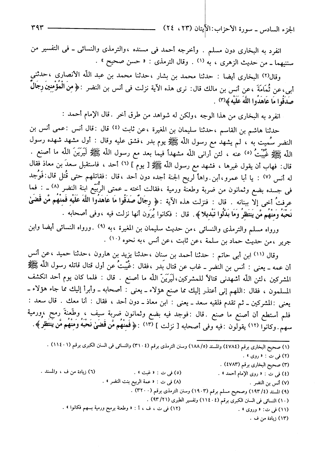 حَدَّثَنَا هَاشِمُ بْنُ الْقَاسِمِ، حَدَّثَنَا سُلَيْمَانُ بْنُ الْمُغِيرَةِ، عَنْ ثَابِتٍ (4) قَالَ: قَالَ أَنَسٌ: عَمِيَ أَنَسُ بْنُ النَّضْرِ سُميت بِهِ، لَمْ يَشْهَدْ مَعَ رَسُولِ اللَّهِ صَلَّى اللَّهُ عَلَيْهِ وَسَلَّمَ يوم بَدْرٍ، فَشَقَّ عَلَيْهِ وَقَالَ: أَوَّلُ مَشْهَدٍ شَهِدَهُ رَسُولُ اللَّهِ صَلَّى اللَّهُ عَلَيْهِ وَسَلَّمَ غُيِّبْتُ (5) عَنْهُ، لَئِنْ أَرَانِي اللَّهُ مَشْهَدًا فِيمَا بَعْدُ مَعَ رَسُولِ اللَّهِ صَلَّى اللَّهُ عَلَيْهِ وَسَلَّمَ لَيَرَيَنَ اللَّهُ مَا أَصْنَعُ. قَالَ: فَهَابَ أَنْ يَقُولَ غَيْرَهَا، فَشَهِدَ مَعَ رَسُولِ اللَّهِ صَلَّى اللَّهُ عَلَيْهِ وَسَلَّمَ [يَوْمَ] (6) أُحُدٍ، فَاسْتَقْبَلَ سعدَ بْنَ مُعَاذٍ فَقَالَ لَهُ أَنَسٌ (7) يَا أَبَا عَمْرٍو، أبِنْ. وَاهًا لِرِيحِ الْجَنَّةِ أَجِدُهُ دُونَ أُحُدٍ، قَالَ: فَقَاتَلَهُمْ حَتَّى قُتل قَالَ: فَوُجد فِي جَسَدِهِ بِضْعٌ وَثَمَانُونَ مِنْ ضَرْبَةٍ وَطَعْنَةٍ وَرَمْيَةٍ، فَقَالَتْ أُخْتُهُ -عَمَّتِي الرُّبَيّع ابْنَةُ النَّضْرِ (8) -: فَمَا عرفتُ أَخِي إِلَّا بِبَنَانِهِ. قَالَ: فَنَزَلَتْ هذه الآية: {رِجَالٌ صَدَقُوا مَا عَاهَدُوا اللَّهَ عَلَيْهِ فَمِنْهُمْ مَنْ قَضَى نَحْبَهُ وَمِنْهُمْ مَنْ يَنْتَظِرُ وَمَا بَدَّلُوا تَبْدِيلا} . قَالَ: فَكَانُوا يُرَون أَنَّهَا نَزَلَتْ فِيهِ، وَفِي أَصْحَابِهِ.