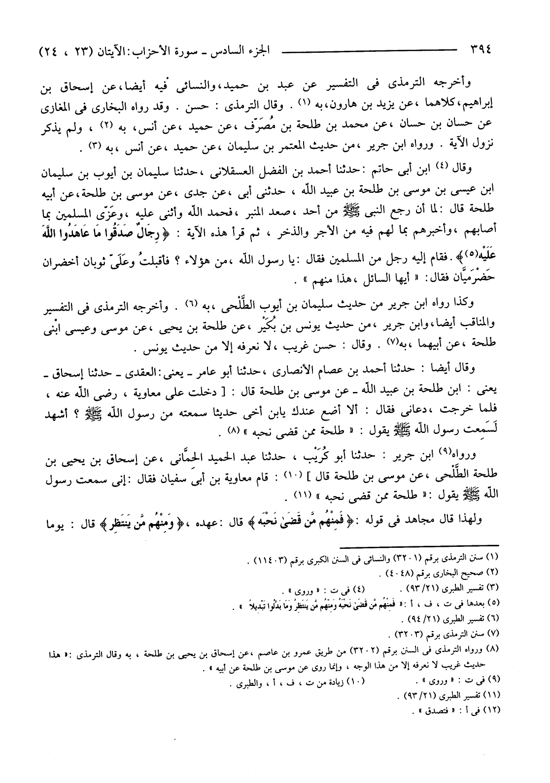 وَكَذَا رَوَاهُ ابْنُ جَرِيرٍ مِنْ حَدِيثِ سُلَيْمَانَ بْنِ أَيُّوبَ الطَّلْحي، بِهِ (6) . وَأَخْرَجَهُ التِّرْمِذِيُّ فِي التَّفْسِيرِ وَالْمَنَاقِبِ أَيْضًا، وَابْنُ جَرِيرٍ، مِنْ حَدِيثِ يُونُسَ بْنِ بُكَيْر، عَنْ طَلْحَةَ بْنِ يَحْيَى، عَنْ مُوسَى وَعِيسَى ابْنِي طَلْحَةَ، عَنْ أَبِيهِمَا، بِهِ (7) . وَقَالَ: حَسَنٌ غَرِيبٌ، لَا نَعْرِفُهُ إِلَّا مِنْ حَدِيثِ يُونُسَ.