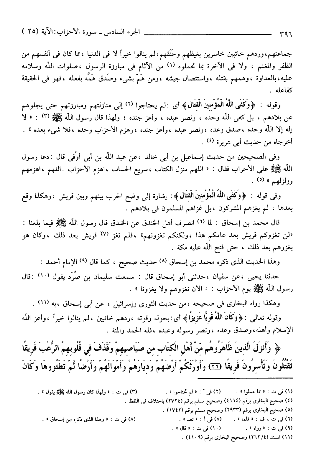 وَقَوْلُهُ: {وَكَفَى اللَّهُ الْمُؤْمِنِينَ الْقِتَالَ} أَيْ: لَمْ يَحْتَاجُوا (2) إِلَى مُنَازَلَتِهِمْ وَمُبَارَزَتِهِمْ حَتَّى يُجْلُوهُمْ عَنْ بِلَادِهِمْ، بَلْ كَفَى اللَّهُ وَحْدَهُ، وَنَصَرَ عَبْدَهُ، وأعزَّ جُنْدَهُ؛ وَلِهَذَا قَالَ رَسُولُ اللَّهِ صَلَّى اللَّهُ عَلَيْهِ وَسَلَّمَ (3) لَا إِلَهَ إِلَّا اللَّهُ وَحْدَهُ، صَدَقَ وَعْدَهُ، وَنَصَرَ عَبْدَهُ، وأعزَّ جُنْدَهُ، وَهَزَمَ الْأَحْزَابَ وَحْدَهُ، فَلَا شَيْءَ بَعْدَهُ". أَخْرَجَاهُ مِنْ حَدِيثِ أَبِي هُرَيْرَةَ (4) .