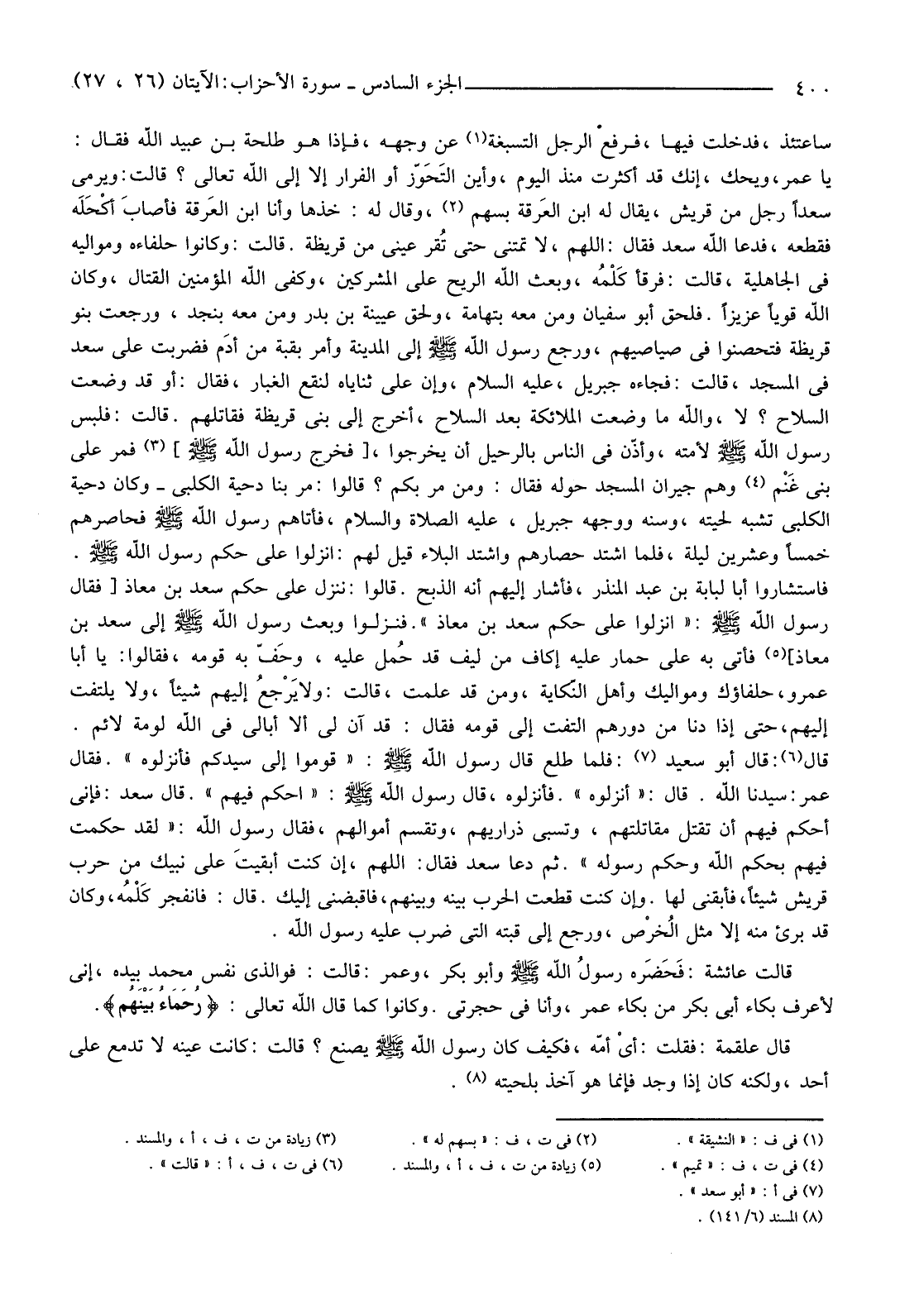 سَاعَتَئِذٍ، فَدَخَلْتُ فِيهَا، فَرَفَعَ الرَّجُلُ التَّسْبِغَةَ (1) عَنْ وَجْهِهِ، فَإِذَا هُوَ طَلْحَةُ بْنُ عُبَيْدِ اللَّهِ فَقَالَ: يَا عُمَرُ، وَيْحَكَ، إِنَّكَ قَدْ أَكْثَرْتَ مُنْذُ الْيَوْمِ، وَأَيْنَ التَحَوُّز أَوِ الْفِرَارُ إِلَّا إِلَى اللَّهِ تَعَالَى؟ قَالَتْ: وَيَرْمِي سَعْدًا رَجُلٌ مِنْ قُرَيْشٍ، يُقَالُ لَهُ ابْنُ العَرقة بِسَهْمٍ (2) ، وَقَالَ لَهُ: خُذْهَا وَأَنَا ابْنُ العَرقة فأصابَ أكْحَلَه فَقَطَعَهُ، فَدَعَا اللَّهَ سَعْدٌ فَقَالَ: اللَّهُمَّ، لَا تُمِتْنِي حَتَّى تُقر عَيْنِي مِنْ قُرَيْظَةَ. قَالَتْ: وَكَانُوا حُلَفَاءَهُ وَمَوَالِيَهُ فِي الْجَاهِلِيَّةِ، قَالَتْ: فَرَقَأَ كَلْمُه، وَبَعَثَ اللَّهُ الرِّيحَ عَلَى الْمُشْرِكِينَ، وَكَفَى اللَّهُ الْمُؤْمِنِينَ الْقِتَالَ، وَكَانَ اللَّهُ قَوِيًّا عَزِيزًا. فَلَحِقَ أَبُو سُفْيَانَ ومَنْ مَعَهُ بِتِهَامَةَ، وَلَحِقَ عُيَيْنَةُ بْنُ بَدْرٍ ومَنْ مَعَهُ بِنَجْدٍ، وَرَجَعَتْ بَنُو قُرَيْظَةَ فَتَحَصَّنُوا فِي صَيَاصِيهِمْ، وَرَجَعَ رَسُولُ اللَّهِ صَلَّى اللَّهُ عَلَيْهِ وَسَلَّمَ إلى الْمَدِينَةِ وَأَمَرَ بِقُبَّةٍ مِنْ أَدَمٍ فَضُرِبَتْ عَلَى سَعْدٍ فِي الْمَسْجِدِ، قَالَتْ: فَجَاءَهُ جِبْرِيلُ، عَلَيْهِ السَّلَامُ، وَإِنَّ عَلَى ثَنَايَاهُ لَنَقْعُ الْغُبَارِ، فَقَالَ: أو قد وَضَعْتَ السِّلَاحَ؟ لَا وَاللَّهِ مَا وَضَعَتِ الْمَلَائِكَةُ بَعْدُ السِّلَاحَ، اخْرُجْ إِلَى بَنِي قُرَيْظَةَ فَقَاتِلْهُمْ. قَالَتْ: فَلَبِسَ رَسُولُ اللَّهِ صَلَّى اللَّهُ عَلَيْهِ وَسَلَّمَ لَأْمَتَهُ، وَأَذَّنَ فِي النَّاسِ بِالرَّحِيلِ أَنْ يَخْرُجُوا، [فَخَرَجَ رَسُولُ اللَّهِ صَلَّى اللَّهُ عَلَيْهِ وَسَلَّمَ] (3) فَمَرَّ عَلَى بَنِي غَنْم (4) وَهُمْ جِيرَانُ الْمَسْجِدِ حَوْلَهُ فَقَالَ: ومَنْ مَرَّ بِكُمْ؟ قَالُوا: مَرَّ بِنَا دِحْيَةُ الْكَلْبِيُّ -وَكَانَ دِحْيَةُ الْكَلْبِيُّ تُشْبِهُ لِحْيَتُهُ، وَسِنُّهُ وَوَجْهُهُ جِبْرِيلَ، عَلَيْهِ الصَّلَاةُ وَالسَّلَامُ، فَأَتَاهُمْ رَسُولُ اللَّهِ صَلَّى اللَّهُ عَلَيْهِ وَسَلَّمَ فَحَاصَرَهُمْ خَمْسًا وَعِشْرِينَ لَيْلَةً، فَلَمَّا اشْتَدَّ حِصَارُهُمْ وَاشْتَدَّ الْبَلَاءُ قِيلَ لَهُمْ: انْزِلُوا عَلَى حُكْمِ رَسُولِ اللَّهِ صَلَّى اللَّهُ عَلَيْهِ وَسَلَّمَ. فَاسْتَشَارُوا أَبَا لُبَابَةَ بْنَ عَبْدِ الْمُنْذِرِ، فَأَشَارَ إِلَيْهِمْ أَنَّهُ الذَّبْحُ. قَالُوا: نَنْزِلُ عَلَى حُكْمِ سَعْدِ بْنِ مُعَاذٍ [فَقَالَ رَسُولُ اللَّهِ صَلَّى اللَّهُ عَلَيْهِ وَسَلَّمَ: "انْزِلُوا عَلَى حُكْمِ سَعْدِ بْنِ مُعَاذٍ". فَنَزَلُوا وَبَعَثَ رَسُولُ اللَّهِ صَلَّى اللَّهُ عَلَيْهِ وَسَلَّمَ إِلَى سَعْدِ بْنِ مُعَاذٍ] (5) فَأُتِيَ بِهِ عَلَى حِمَارٍ عَلَيْهِ إِكَافٌ مِنْ لِيفٍ قَدْ حُمِل عَلَيْهِ، وحَفّ بِهِ قَوْمُهُ، فَقَالُوا: يَا أَبَا عَمْرٍو، حُلَفَاؤُكَ وَمُوَالِيكَ وَأَهْلُ النِّكَايَةِ، ومَنْ قَدْ عَلِمْتَ، قَالَتْ: وَلَا يَرْجعُ إِلَيْهِمْ شَيْئًا، وَلَا يَلْتَفِتُ إِلَيْهِمْ، حَتَّى إِذَا دَنَا مِنْ دُورِهِمُ الْتَفَتَ إِلَى قَوْمِهِ فَقَالَ: قَدْ آنَ لِي أَلَّا أُبَالِيَ فِي اللَّهِ لَوْمَةَ لَائِمٍ. قَالَ (6) : قَالَ أَبُو سَعِيدٍ (7) : فَلَمَّا طَلَعَ قَالَ رَسُولُ اللَّهِ صَلَّى اللَّهُ عَلَيْهِ وَسَلَّمَ: "قُومُوا إِلَى سَيِّدِكُمْ فَأَنْزِلُوهُ". فَقَالَ عُمَرُ: سَيِّدُنَا اللَّهُ. قَالَ: "أَنْزِلُوهُ". فَأَنْزَلُوهُ، قَالَ رَسُولُ اللَّهِ صَلَّى اللَّهُ عَلَيْهِ وَسَلَّمَ: "احْكُمْ فِيهِمْ". قَالَ سَعْدٌ: فَإِنِّي أَحْكُمُ فِيهِمْ أَنْ تَقْتُلَ مُقَاتِلَتَهُمْ، وَتَسْبَيَ ذَرَارِيَهُمْ، وَتَقْسِمَ أَمْوَالَهُمْ، فَقَالَ رَسُولُ اللَّهِ: "لَقَدْ حَكَمْتَ فِيهِم