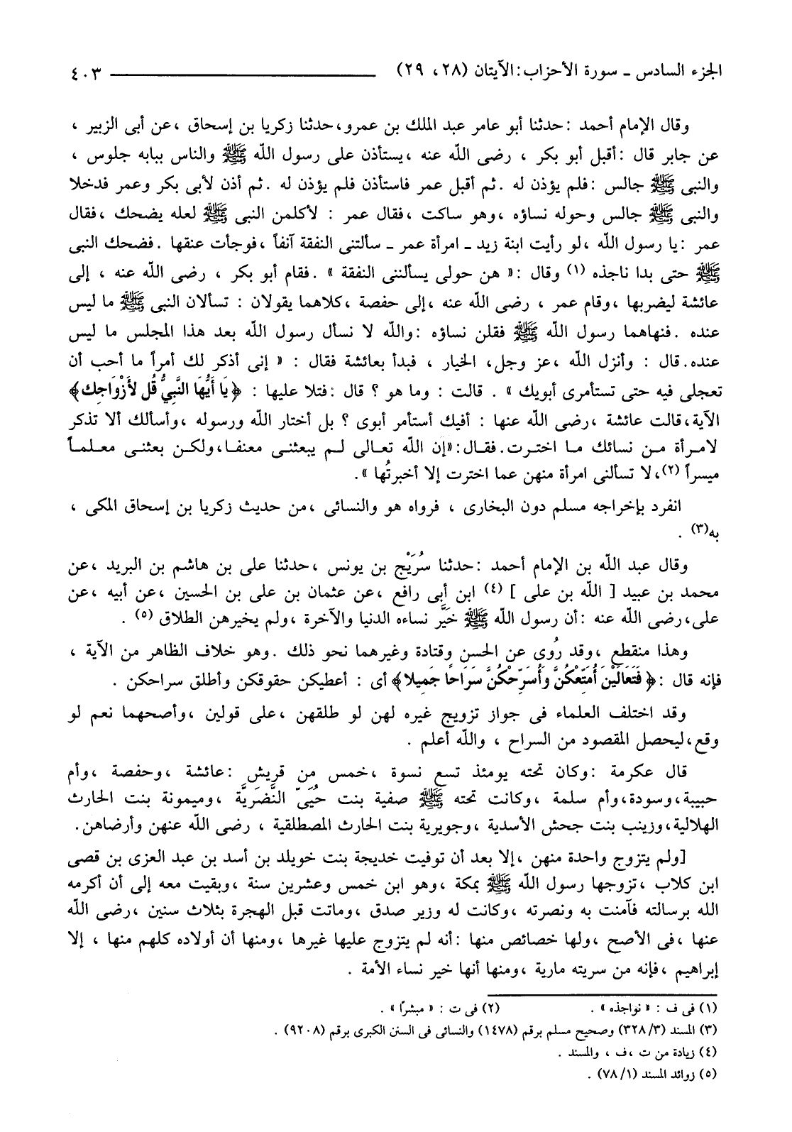 وَقَالَ الْإِمَامُ أَحْمَدُ: حَدَّثَنَا أَبُو عَامِرٍ عَبْدُ الْمَلِكِ بْنُ عَمْرٍو، حَدَّثَنَا زَكَرِيَّا بْنُ إِسْحَاقَ، عَنْ أَبِي الزُّبَيْرِ، عَنْ جَابِرٍ قَالَ: أَقْبَلَ أَبُو بَكْرٍ، رَضِيَ اللَّهُ عَنْهُ، يَسْتَأْذِنُ عَلَى رسول الله صلى الله عليه وسلم والناس بِبَابِهِ جُلُوسٌ، وَالنَّبِيُّ صَلَّى اللَّهُ عَلَيْهِ وَسَلَّمَ جَالِسٌ: فَلَمْ يُؤْذَنْ لَهُ. ثُمَّ أَقْبَلَ عُمَرُ فَاسْتَأْذَنَ فَلَمْ يُؤْذَنْ لَهُ. ثُمَّ أَذِنَ لِأَبِي بَكْرٍ وَعُمَرَ فَدَخْلَا وَالنَّبِيُّ صَلَّى اللَّهُ عَلَيْهِ وَسَلَّمَ جَالِسٌ وَحَوْلَهُ نِسَاؤُهُ، وَهُوَ سَاكِتٌ، فَقَالَ عُمَرُ: لَأُكَلِّمَنَّ النَّبِيَّ صَلَّى اللَّهُ عَلَيْهِ وَسَلَّمَ لَعَلَّهُ يَضْحَكُ، فَقَالَ عُمَرُ: يَا رَسُولَ اللَّهِ، لَوْ رَأَيْتَ ابْنَةَ زَيْدٍ -امْرَأَةَ عُمَرَ -سَأَلَتْنِي النَّفَقَةَ آنِفًا، فَوَجَأْتُ عُنُقَهَا. فَضَحِكَ النَّبِيُّ صَلَّى اللَّهُ عَلَيْهِ وَسَلَّمَ حَتَّى بَدَا نَاجِذُهُ (1) وَقَالَ: "هُنَّ حَوْلِي يَسْأَلْنَنِي النَّفَقَةَ". فَقَامَ أَبُو بَكْرٍ، رَضِيَ اللَّهُ عَنْهُ، إِلَى عَائِشَةَ لِيَضْرِبَهَا، وَقَامَ عُمَرُ، رَضِيَ اللَّهُ عَنْهُ، إِلَى حَفْصَةَ، كِلَاهُمَا يَقُولَانِ: تَسْأَلَانِ النَّبِيَّ صَلَّى اللَّهُ عَلَيْهِ وَسَلَّمَ مَا لَيْسَ عِنْدَهُ. فَنَهَاهُمَا رَسُولُ اللَّهِ صَلَّى اللَّهُ عَلَيْهِ وَسَلَّمَ فَقُلْنَ نِسَاؤُهُ: وَاللَّهِ لَا نَسْأَلُ رَسُولَ اللَّهِ بَعْدَ هَذَا الْمَجْلِسِ مَا لَيْسَ عِنْدَهُ. قَالَ: وَأَنْزَلَ اللَّهُ، عَزَّ وَجَلَّ، الْخِيَارَ، فَبَدَأَ بِعَائِشَةَ فَقَالَ: "إِنِّي أَذْكُرُ لَكِ أَمْرًا مَا أُحِبُّ أَنْ تَعْجَلِي فِيهِ حَتَّى تَسْتَأْمِرِي أَبَوَيْكِ". قَالَتْ: وَمَا هُوَ؟ قَالَ: فَتَلَا عَلَيْهَا: {يَا أَيُّهَا النَّبِيُّ قُلْ لأزْوَاجِكَ} الْآيَةَ، قَالَتْ عَائِشَةُ، رَضِيَ اللَّهُ عَنْهَا: أَفِيكَ أَسْتَأْمِرُ أَبَوَيَّ؟ بَلْ أَخْتَارُ اللَّهَ وَرَسُولَهُ، وَأَسْأَلُكَ أَلَّا تَذْكُرَ لِامْرَأَةٍ مِنْ نِسَائِكَ مَا اخْتَرْتُ. فَقَالَ: "إِنَّ اللَّهَ تَعَالَى لَمْ يَبْعَثْنِي مُعَنِّفًا، وَلَكِنْ بَعَثَنِي مُعَلِّمًا مُيَسِّرًا (2) ، لَا تَسْأَلَنِي امْرَأَةٌ مِنْهُنَّ عَمَّا اخترتِ إِلَّا أخبرتُها".