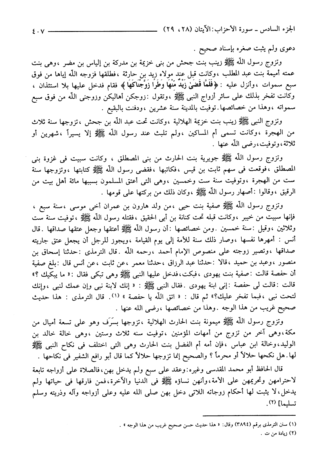 وَتَزَوَّجَ رَسُولُ اللَّهِ صَلَّى اللَّهُ عَلَيْهِ وَسَلَّمَ صَفِيَّةَ بِنْتَ حُيَيٍّ، مِنْ وَلَدِ هَارُونَ بْنِ عِمْرَانَ أَخِي مُوسَى، سَنَةَ سَبْعٍ، فَإِنَّهَا سُبِيَتْ مِنْ خَيْبَرَ، وَكَانَتْ قَبْلَهُ تَحْتَ كِنَانَةَ بْنِ أَبِي الْحَقِيقِ، فَقَتَلَهُ رَسُولُ اللَّهِ صَلَّى اللَّهُ عَلَيْهِ وَسَلَّمَ، تُوُفِّيَتْ سَنَةَ سِتٍّ وَثَلَاثِينَ، وَقِيلَ: سَنَةَ خَمْسِينَ. وَمِنْ خَصَائِصِهَا: أَنَّ رَسُولَ اللَّهِ صَلَّى اللَّهُ عَلَيْهِ وَسَلَّمَ أَعْتَقَهَا وَجَعَلَ عِتْقَهَا صَدَاقَهَا. قَالَ أَنَسٌ: أَمْهَرَهَا نَفْسَهَا، وَصَارَ ذَلِكَ سُنَّةً لِلْأَمَةِ إِلَى يَوْمِ الْقِيَامَةِ، وَيَجُوزُ لِلرَّجُلِ أَنْ يَجْعَلَ عِتْقَ جَارِيَتِهِ صَدَاقَهَا، وَتَصِيرُ زَوْجَتَهُ عَلَى مَنْصُوصِ الْإِمَامِ أَحْمَدَ، رَحِمَهُ اللَّهُ. قَالَ التِّرْمِذِيُّ: حَدَّثَنَا إِسْحَاقُ بْنُ مَنْصُورٍ، وَعَبْدُ بْنُ حُمَيْدٍ، قَالَا حَدَّثَنَا عَبْدُ الرَّزَّاقِ، حَدَّثَنَا مَعْمَرٌ، عَنْ ثَابِتٍ، عَنْ أَنَسٍ قَالَ: بَلَغَ صَفِيَّةَ أَنَّ حَفْصَةَ قَالَتْ: صَفِيَّةُ بِنْتُ يَهُودِيٍّ، فَبَكَتْ، فَدَخَلَ عَلَيْهَا النَّبِيُّ صَلَّى اللَّهُ عَلَيْهِ وَسَلَّمَ وَهِيَ تَبْكِي فَقَالَ: "مَا يُبْكِيكِ؟ " قَالَتْ: قَالَتْ لِي حَفْصَةُ: إِنِّي ابْنَةُ يَهُودِيٍّ. فَقَالَ النَّبِيُّ صَلَّى اللَّهُ عَلَيْهِ وَسَلَّمَ: "إِنَّكِ لَابْنَةُ نَبِيٍّ وَإِنَّ عَمَّكِ لَنَبِيٌّ، وَإِنَّكِ لِتَحْتَ نَبِيٍّ، فَبِمَا تَفْخَرُ عَلَيْكِ؟ " ثُمَّ قَالَ: "اتَّقِ اللَّهَ يَا حَفْصَةُ". (1) قَالَ التِّرْمِذِيُّ: هَذَا حَدِيثٌ صَحِيحٌ غَرِيبٌ مِنْ هَذَا الْوَجْهِ. وَهَذَا مِنْ خَصَائِصِهَا، رَضِيَ اللَّهُ عَنْهَا.