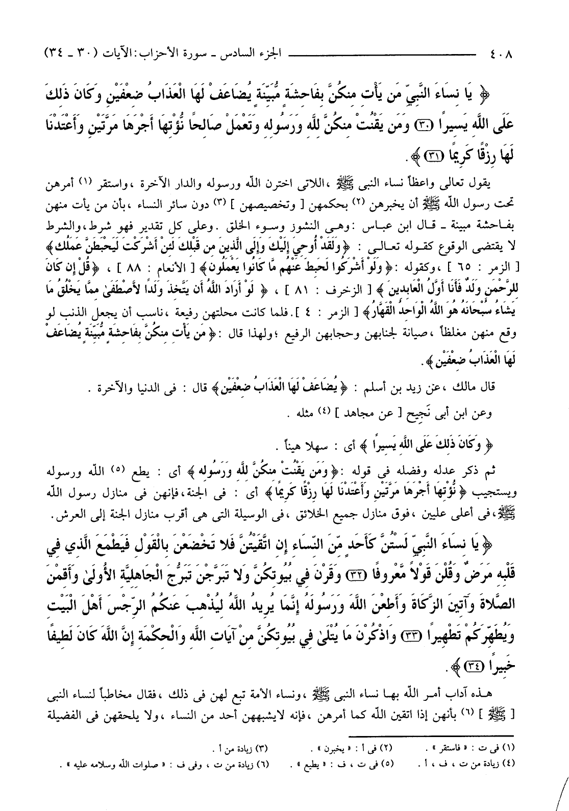 {يَا نِسَاءَ النَّبِيِّ مَنْ يَأْتِ مِنْكُنَّ بِفَاحِشَةٍ مُبَيِّنَةٍ يُضَاعَفْ لَهَا الْعَذَابُ ضِعْفَيْنِ وَكَانَ ذَلِكَ عَلَى اللَّهِ يَسِيرًا (30) }