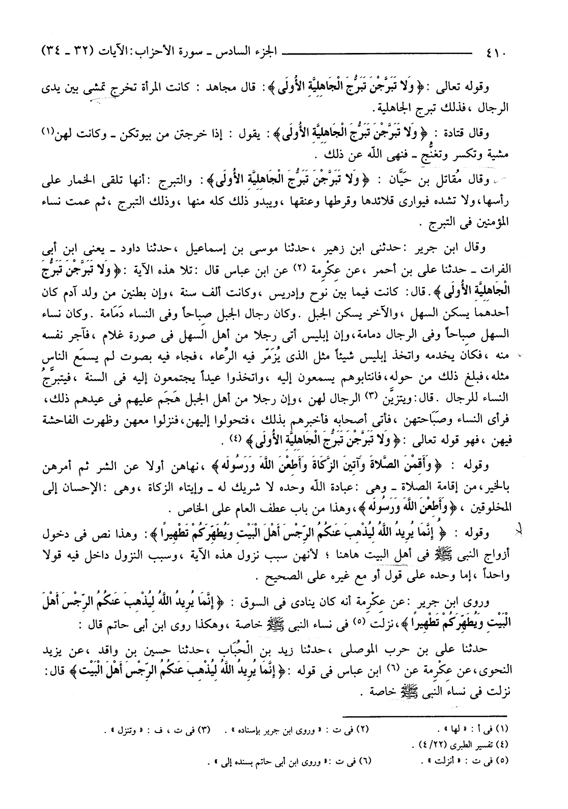 وَقَالَ مُقَاتِلُ بْنُ حَيَّانَ: {وَلا تَبَرَّجْنَ تَبَرُّجَ الْجَاهِلِيَّةِ الأولَى} وَالتَّبَرُّجُ: أَنَّهَا تُلْقِي الْخِمَارَ عَلَى رَأْسِهَا، وَلَا تَشُدُّهُ فَيُوَارِي قَلَائِدَهَا وَقُرْطَهَا وَعُنُقَهَا، وَيَبْدُو ذَلِكَ كُلُّهُ مِنْهَا، وَذَلِكَ التَّبَرُّجُ، ثُمَّ عُمَّتْ نِسَاءُ الْمُؤْمِنِينَ فِي التَّبَرُّجِ. وَقَالَ ابْنُ جَرِيرٍ: حَدَّثَنِي ابْنُ زُهَيْرٍ، حَدَّثَنَا مُوسَى بْنُ إِسْمَاعِيلَ، حَدَّثَنَا دَاوُدُ -يَعْنِي ابْنَ أَبِي الْفُرَاتِ -حَدَّثَنَا عَلِيُّ بْنُ أَحْمَرَ، عَنْ عِكْرِمة (2) عَنِ ابْنِ عَبَّاسٍ قَالَ: تَلَا هَذِهِ الْآيَةَ: {وَلا تَبَرَّجْنَ تَبَرُّجَ الْجَاهِلِيَّةِ الأولَى} . قَالَ: كَانَتْ فِيمَا بَيْنَ نُوحٍ وَإِدْرِيسَ، وَكَانَتْ أَلْفَ سَنَةٍ، وَإِنَّ بَطْنَيْنِ مِنْ وَلَدِ آدَمَ كَانَ أَحَدُهُمَا يَسْكُنُ السَّهْلَ، وَالْآخِرُ يَسْكُنُ الْجَبَلَ. وَكَانَ رِجَالُ الْجَبَلِ صِبَاحًا وَفِي النِّسَاءِ دَمَامة. وَكَانَ نِسَاءُ السَّهْلِ صِبَاحًا وَفِي الرِّجَالِ دَمَامَةٌ، وَإِنَّ إِبْلِيسَ أَتَى رَجُلًا مِنْ أَهْلِ السَّهْلِ فِي صُورَةِ غُلَامٍ، فَآجَرَ نَفْسَهُ مِنْهُ، فَكَانَ يَخْدِمُهُ وَاتَّخَذَ إِبْلِيسُ شَيْئًا مِثْلَ الَّذِي يُزَمّر فِيهِ الرِّعاء، فَجَاءَ فِيهِ بِصَوْتٍ لَمْ يسمَع النَّاسُ مِثْلَهُ، فَبَلَغَ ذَلِكَ مَنْ حَوْلَهُ، فَانْتَابُوهُمْ يَسْمَعُونَ إِلَيْهِ، وَاتَّخِذُوا عِيدًا يَجْتَمِعُونَ إِلَيْهِ فِي السَّنَةِ، فيتبرَّجُ النِّسَاءُ لِلرِّجَالِ. قَالَ: ويتزيَّن (3) الرِّجَالُ لَهُنَّ، وَإِنَّ رَجُلًا مِنْ أَهْلِ الْجَبَلِ هَجَم عَلَيْهِمْ فِي عِيدِهِمْ ذَلِكَ، فَرَأَى النِّسَاءَ وصَبَاحتهن، فَأَتَى أَصْحَابَهُ فَأَخْبَرَهُمْ بِذَلِكَ، فَتَحَوَّلُوا إِلَيْهِنَّ، فَنَزَلُوا مَعَهُنَّ وَظَهَرَتِ الْفَاحِشَةُ فِيهِنَّ، فَهُوَ قَوْلُهُ تَعَالَى: {وَلا تَبَرَّجْنَ تَبَرُّجَ الْجَاهِلِيَّةِ الأولَى} (4) .