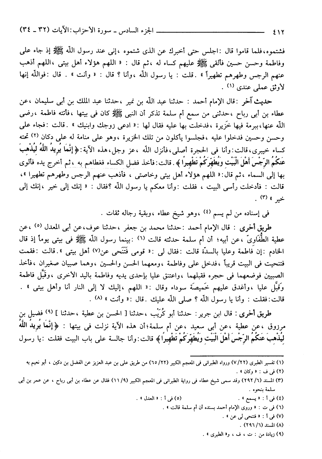 طَرِيقٌ أُخْرَى: قَالَ ابْنُ جَرِيرٍ: حَدَّثَنَا أَبُو كُرَيْب، حَدَّثَنَا [الْحَسَنُ بْنُ عَطِيَّةَ، حَدَّثَنَا] (9) فُضَيْلِ بْنِ مَرْزُوقٍ، عَنْ عَطِيَّةَ، عَنْ أَبِي سَعِيدٍ، عَنْ أُمِّ سَلَمَةَ؛ أَنَّ هَذِهِ الْآيَةَ نَزَلَتْ فِي بَيْتِهَا: {إِنَّمَا يُرِيدُ اللَّهُ لِيُذْهِبَ عَنْكُمُ الرِّجْسَ أَهْلَ الْبَيْتِ وَيُطَهِّرَكُمْ تَطْهِيرًا} قَالَتْ: وَأَنَا جَالِسَةٌ عَلَى بَابِ الْبَيْتِ فَقُلْتُ: يَا رسول