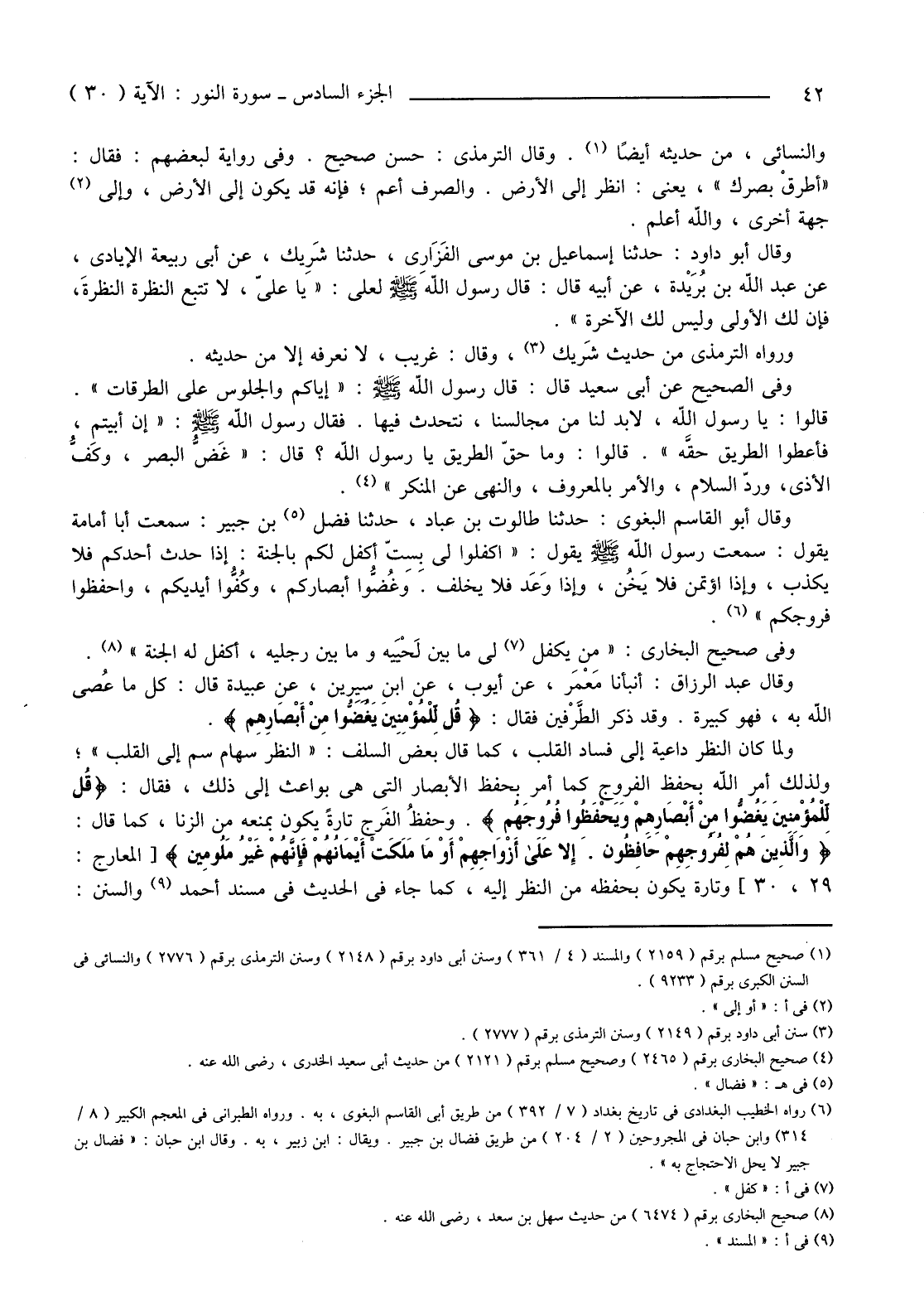 وَفِي الصَّحِيحِ عَنْ أَبِي سَعِيدٍ قَالَ: قَالَ رَسُولُ اللَّهِ صَلَّى اللَّهُ عَلَيْهِ وَسَلَّمَ: "إِيَّاكُمْ وَالْجُلُوسَ عَلَى الطُّرُقَاتِ". قَالُوا: يَا رَسُولَ اللَّهِ، لَا بُدَّ لَنَا مِنْ مَجَالِسِنَا، نَتَحَدَّثُ فِيهَا. فَقَالَ رَسُولُ اللَّهِ صَلَّى اللَّهُ عَلَيْهِ وَسَلَّمَ: "إِنْ أَبَيْتُمْ، فَأَعْطُوا الطَّرِيقَ حقَّه". قَالُوا: وَمَا حَقُّ الطَّرِيقِ يَا رَسُولَ اللَّهِ؟ قَالَ: "غَضُّ الْبَصَرِ، وكَفُّ الْأَذَى، وَرَدُّ السَّلَامِ، وَالْأَمْرُ بِالْمَعْرُوفِ، وَالنَّهْيُ عَنِ الْمُنْكَرِ" (4) .