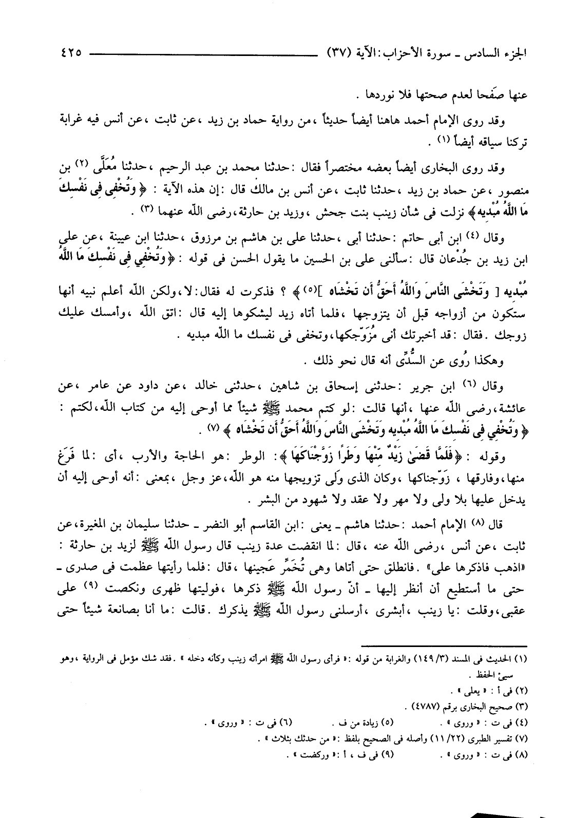 وَقَدْ رَوَى الْبُخَارِيُّ أَيْضًا بَعْضَهُ مُخْتَصَرًا فَقَالَ: حَدَّثَنَا مُحَمَّدُ بْنُ عَبْدِ الرَّحِيمِ، حَدَّثَنَا مُعَلَّى (2) بْنُ مَنْصُورٍ، عَنْ حَمَّادِ بْنِ زَيْدٍ، حَدَّثَنَا ثَابِتٌ، عَنْ أَنَسِ بْنِ مَالِكٍ قَالَ: إِنَّ هَذِهِ الْآيَةَ: {وَتُخْفِي فِي نَفْسِكَ مَا اللَّهُ مُبْدِيهِ} نَزَلَتْ فِي شَأْنِ زَيْنَبَ بِنْتِ جَحْشٍ، وَزَيْدِ بْنِ حَارِثَةَ، رَضِيَ اللَّهُ عَنْهُمَا (3) .