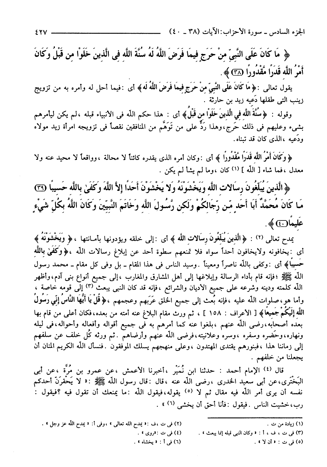 {الَّذِينَ يُبَلِّغُونَ رِسَالاتِ اللَّهِ وَيَخْشَوْنَهُ وَلا يَخْشَوْنَ أَحَدًا إِلا اللَّهَ وَكَفَى بِاللَّهِ حَسِيبًا (39) مَا كَانَ مُحَمَّدٌ أَبَا أَحَدٍ مِنْ رِجَالِكُمْ وَلَكِنْ رَسُولَ اللَّهِ وَخَاتَمَ النَّبِيِّينَ وَكَانَ اللَّهُ بِكُلِّ شَيْءٍ عَلِيمًا (40) } .