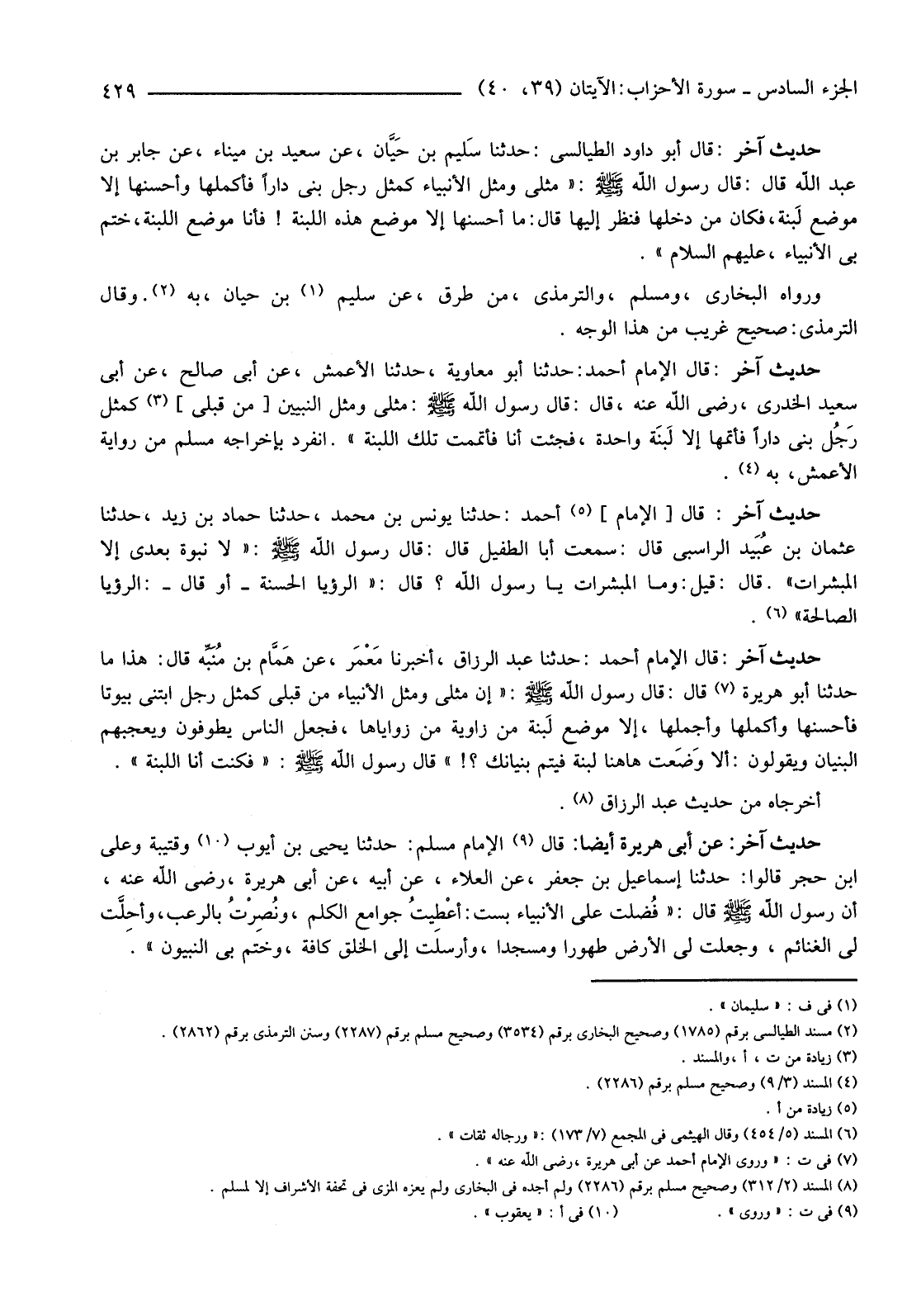 حَدِيثٌ آخَرُ: قَالَ الْإِمَامُ أَحْمَدُ: حَدَّثَنَا أَبُو مُعَاوِيَةَ، حَدَّثَنَا الْأَعْمَشُ، عَنْ أَبِي صَالِحٍ، عَنْ أَبِي سَعِيدٍ الْخُدْرِيِّ، رَضِيَ اللَّهُ عَنْهُ، قَالَ: قَالَ رَسُولُ اللَّهِ صَلَّى اللَّهُ عَلَيْهِ وَسَلَّمَ: مَثَلِي وَمَثَلُ النَّبِيِّينَ [مِنْ قَبْلِي] (3) كَمَثَلِ رَجُلٍ بَنَى دَارًا فَأَتَمَّهَا إِلَّا لَبنَة وَاحِدَةً، فَجِئْتُ أَنَا فَأَتْمَمْتُ تِلْكَ اللَّبِنَةِ". انْفَرَدَ بِإِخْرَاجِهِ مُسْلِمٌ مِنْ رِوَايَةِ الْأَعْمَشِ، بِهِ (4) .