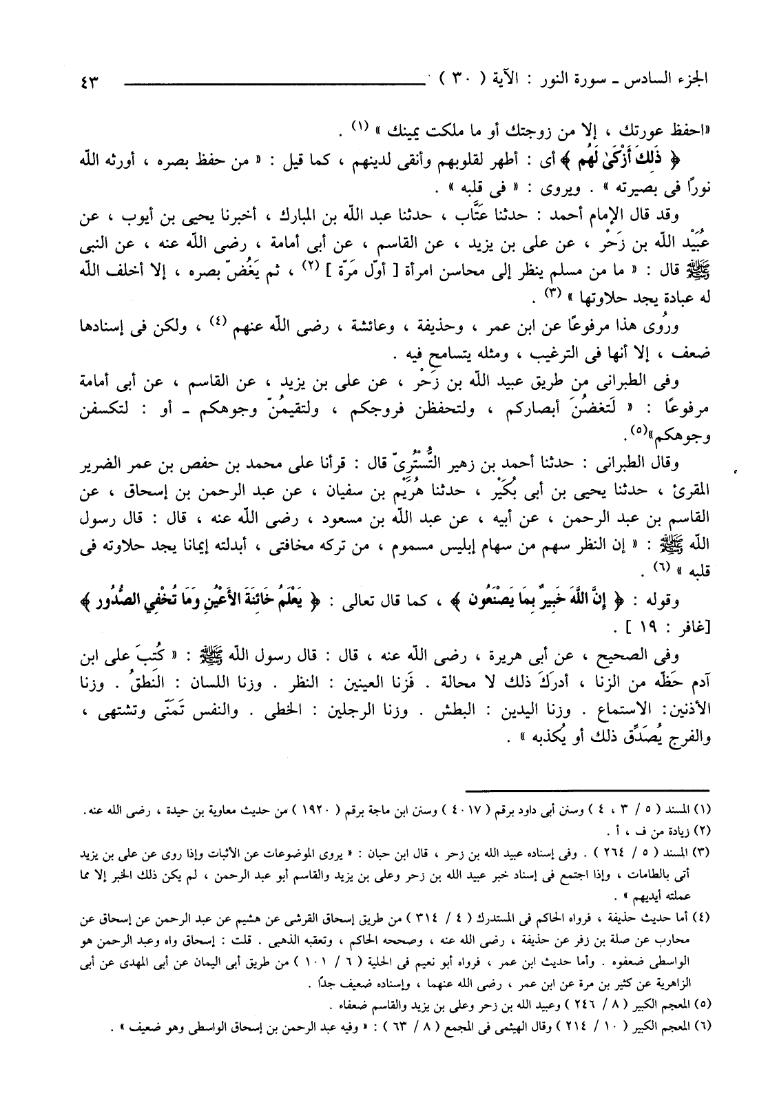 وَفِي الطَّبَرَانِيِّ مِنْ طَرِيقِ عُبَيْدِ اللَّهِ بْنِ زَحْر،، عَنْ عَلِيِّ بْنِ يَزِيدَ، عَنِ الْقَاسِمِ، عَنْ أبي أُمَامَةَ مَرْفُوعًا: "لَتغضُنَّ أَبْصَارَكُمْ، وَلَتَحْفَظُنَّ فُرُوجَكُمْ، ولتقيمُنّ وُجُوهَكُمْ -أَوْ: لَتُكْسَفَنَّ وُجُوهُكُمْ" (5) .
