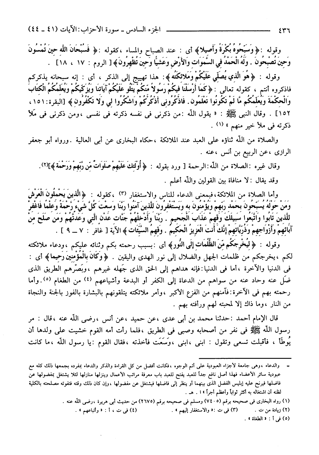 وَقَوْلُهُ: {هُوَ الَّذِي يُصَلِّي عَلَيْكُمْ وَمَلائِكَتُهُ} : هَذَا تَهْيِيجٌ إِلَى الذِّكْرِ، أَيْ: إِنَّهُ سُبْحَانَهُ يَذْكُرُكُمْ فَاذْكُرُوهُ أَنْتُمْ، كَقَوْلِهِ تَعَالَى: {كَمَا أَرْسَلْنَا فِيكُمْ رَسُولا مِنْكُمْ يَتْلُو عَلَيْكُمْ آيَاتِنَا وَيُزَكِّيكُمْ وَيُعَلِّمُكُمُ الْكِتَابَ وَالْحِكْمَةَ وَيُعَلِّمُكُمْ مَا لَمْ تَكُونُوا تَعْلَمُونَ. فَاذْكُرُونِي أَذْكُرْكُمْ وَاشْكُرُوا لِي وَلا تَكْفُرُونِ} [الْبَقَرَةِ: 151، 152] . وَقَالَ النَّبِيِّ صَلَّى اللَّهُ عَلَيْهِ وَسَلَّمَ: "يَقُولُ اللَّهُ: مَنْ ذَكَرَنِي فِي نَفْسِهِ ذَكَرْتُهُ فِي نَفْسِي، ومَنْ ذَكَرَنِي فِي مَلأ ذَكَرْتُهُ فِي مَلَأٍ خَيْرٍ مِنْهُمْ" (1)