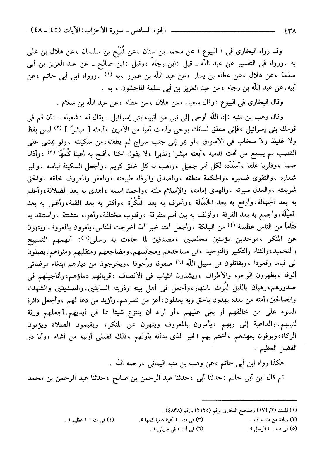 وَقَالَ وَهْبُ بْنُ مُنَبِّهٍ: إِنَّ اللَّهَ أَوْحَى إِلَى نَبِيٌّ مِنْ أَنْبِيَاءِ بَنِي إِسْرَائِيلَ -يُقَالُ لَهُ: شَعْيَاءُ -أَنْ قُمْ فِي قَوْمِكَ بَنِي إِسْرَائِيلَ، فَإِنِّي مَنْطِقٌ لِسَانَكَ بِوَحْيٍ وَأَبْعَثُ أُمِّيًّا مِنَ الْأُمِّيِّينَ، أَبْعَثُهُ [مُبَشِّرًا] (2) لَيْسَ بِفَظٍّ وَلَا غَلِيظٍ وَلَا سَخَّابٍ فِي الْأَسْوَاقِ، لَوْ يَمُرُّ إِلَى جَنْبِ سِرَاجٍ لَمْ يُطْفِئْهُ، مِنْ سَكِينَتِهِ، وَلَوْ يَمْشِي عَلَى الْقَصَبِ لَمْ يُسْمَعْ مِنْ تَحْتِ قَدَمَيْهِ، أَبْعَثُهُ مُبَشِّرًا وَنَذِيرًا، لَا يَقُولُ الْخَنَا، أَفْتَحُ بِهِ أَعْيُنًا كُمْهًا (3) ، وَآذَانًا صُمًّا، وَقُلُوبًا غُلْفًا، أسَدّده لِكُلِّ أَمْرٍ جَمِيلٍ، وَأَهَبُ لَهُ كُلَّ خُلُقٍ كَرِيمٍ، وَأَجْعَلُ السَّكِينَةَ لِبَاسَهُ، وَالْبِرَّ شِعَارَهُ، وَالتَّقْوَى ضَمِيرَهُ، وَالْحِكْمَةَ مَنْطِقَهُ، وَالصِّدْقَ وَالْوَفَاءَ طَبِيعَتَهُ، وَالْعَفْوَ وَالْمَعْرُوفَ خُلُقَهُ، وَالْحَقَّ شَرِيعَتَهُ، وَالْعَدْلَ سِيرَتَهُ، وَالْهُدَى إِمَامَهُ، وَالْإِسْلَامَ مِلَّتَهُ، وَأَحْمَدَ اسْمَهُ، أَهْدِي بِهِ بَعْدَ الضَّلَالَةِ، وَأُعَلِّمُ بِهِ بَعْدَ الْجَهَالَةِ، وَأَرْفَعُ بِهِ بَعْدَ الخَمَالة، وَأُعْرَفُ بِهِ بَعْدَ النُّكْرَة، وَأُكْثِّرُ بِهِ بَعْدَ الْقِلَّةِ، وَأُغْنِي بِهِ بَعْدَ العَيْلَة، وَأَجْمَعُ بِهِ بَعْدَ الْفُرْقَةِ، وَأُؤَلِّفُ بِهِ بَيْنَ أُمَمٍ مُتَفَرِّقَةٍ، وَقُلُوبٍ مُخْتَلِفَةٍ، وَأَهْوَاءٍ مُتَشَتَّتَةٍ، وَأَسْتَنْقِذُ بِهِ فِئامًا مِنَ النَّاسِ عَظِيمَةً (4) مِنَ الْهَلَكَةِ، وَأَجْعَلُ أُمَّتَهُ خَيْرَ أُمَّةٍ أُخْرِجَتْ لِلنَّاسِ، يَأْمُرُونَ بِالْمَعْرُوفِ وَيَنْهَوْنَ عَنِ الْمُنْكَرِ، مُوَحِّدِينَ مُؤْمِنِينَ مُخْلِصِينَ، مُصَدِّقِينَ لِمَا جَاءَتْ بِهِ رُسُلِي (5) ، أُلْهِمُهُمُ التَّسْبِيحَ وَالتَّحْمِيدَ، وَالثَّنَاءَ وَالتَّكْبِيرَ وَالتَّوْحِيدَ، فِي مَسَاجِدِهِمْ وَمَجَالِسِهِمْ، وَمَضَاجِعِهِمْ وَمُنْقَلَبِهِمْ وَمَثْوَاهُمْ، يُصَلُّونَ لِي قِيَامًا وَقُعُودًا، وَيُقَاتِلُونَ فِي سَبِيلِ اللَّهِ (6) صُفُوفًا وزُحوفا، وَيُخْرِجُونَ مِنْ دِيَارِهِمُ ابْتِغَاءَ مَرْضَاتِي أُلُوفًا، يُطَهِّرُونَ الْوُجُوهَ وَالْأَطْرَافَ، وَيَشُدُّونَ الثِّيَابَ فِي الْأَنْصَافِ، قُرْبَانُهُمْ دِمَاؤُهُمْ، وَأَنَاجِيلُهُمْ فِي صُدُورِهِمْ، رُهْبَانٌ بِاللَّيْلِ ليُوث بِالنَّهَارِ، وَأَجْعَلُ فِي أَهْلِ بَيْتِهِ وَذُرِّيَّتِهِ السَّابِقِينَ وَالصِّدِّيقِينَ وَالشُّهَدَاءَ وَالصَّالِحِينَ، أُمَّتُهُ مِنْ بَعْدِهِ يَهْدُونَ بِالْحَقِّ وَبِهِ يَعْدِلُونَ، أُعِزُّ مَنْ نَصَرَهُمْ، وَأُؤَيِّدُ مَنْ دَعَا لَهُمْ، وَأَجْعَلُ دَائِرَةَ السَّوْءِ عَلَى مَنْ خَالَفَهُمْ أَوْ بَغَى عَلَيْهِمْ، أَوْ أَرَادَ أَنْ يَنْتَزِعَ شَيْئًا مِمَّا فِي أَيْدِيهِمْ. أَجْعَلُهُمْ وَرَثَةً لِنَبِيِّهِمْ، وَالدَّاعِيَةَ إِلَى رَبِّهِمْ، يَأْمُرُونَ بِالْمَعْرُوفِ وَيَنْهَوْنَ عَنِ الْمُنْكَرِ، وَيُقِيمُونَ الصَّلَاةَ وَيُؤْتُونَ الزَّكَاةَ، وَيُوفُونَ بِعَهْدِهِمْ، أَخْتِمُ بِهِمُ الْخَيْرَ الَّذِي بَدَأْتُهُ بِأَوَّلِهِمْ، ذَلِكَ فَضْلِي أُوتِيهِ مَنْ أَشَاءُ، وَأَنَا ذُو الْفَضْلِ الْعَظِيمِ.