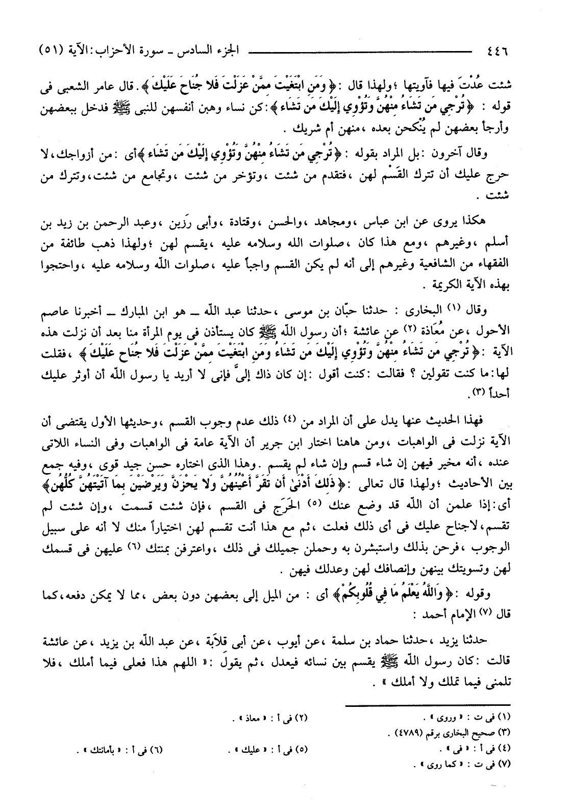 هَكَذَا يُرْوَى عَنِ ابْنِ عَبَّاسٍ، وَمُجَاهِدٍ، وَالْحَسَنِ، وَقَتَادَةَ، وَأَبِي رَزين، وَعَبْدُ الرَّحْمَنِ بْنُ زَيْدِ بْنِ أَسْلَمَ، وَغَيْرُهُمْ، وَمَعَ هَذَا كَانَ، صَلَوَاتُ اللَّهِ وَسَلَامُهُ عَلَيْهِ، يَقْسِمُ لَهُنَّ؛ وَلِهَذَا ذَهَبَ طَائِفَةٌ مِنَ الْفُقَهَاءِ مِنَ الشَّافِعِيَّةِ وَغَيْرِهِمْ إِلَى أَنَّهُ لَمْ يَكُنِ الْقَسْمُ وَاجِبًا عَلَيْهِ، صَلَوَاتُ اللَّهِ وَسَلَامُهُ عَلَيْهِ، وَاحْتَجُّوا بِهَذِهِ الْآيَةِ الْكَرِيمَةِ.