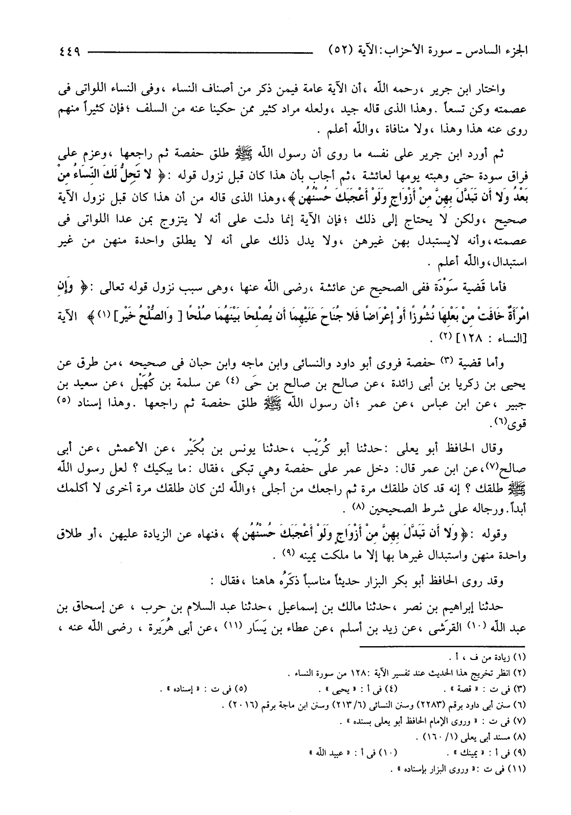 ثُمَّ أَوْرَدَ ابْنُ جَرِيرٍ عَلَى نَفْسِهِ مَا رُوِيَ أَنَّ رَسُولَ اللَّهِ صَلَّى اللَّهُ عَلَيْهِ وَسَلَّمَ طَلَّقَ حَفْصَةَ ثُمَّ رَاجَعَهَا، وَعَزَمَ عَلَى فِرَاقِ سَوْدَةَ حَتَّى وَهَبَتْهُ يَوْمَهَا لِعَائِشَةَ، ثُمَّ أَجَابَ بِأَنَّ هَذَا كَانَ قَبْلَ نُزُولِ قوله: {لا يَحِلُّ لَكَ النِّسَاءُ مِنْ بَعْدُ وَلا أَنْ تَبَدَّلَ بِهِنَّ مِنْ أَزْوَاجٍ وَلَوْ أَعْجَبَكَ حُسْنُهُنَّ} ، وَهَذَا الَّذِي قَالَهُ مِنْ أَنَّ هَذَا كَانَ قَبْلَ نُزُولِ الْآيَةِ صَحِيحٌ، وَلَكِنْ لَا يَحْتَاجُ إِلَى ذَلِكَ؛ فَإِنَّ الْآيَةَ إِنَّمَا دَلَّتْ عَلَى أَنَّهُ لَا يَتَزَوَّجُ بِمَنْ عَدَا اللَّوَاتِي فِي عِصْمَتِهِ، وَأَنَّهُ لَا يَسْتَبْدِلُ بِهِنَّ غَيْرَهُنَّ، وَلَا يَدُلُّ ذَلِكَ عَلَى أَنَّهُ لَا يُطَلِّقُ وَاحِدَةً مِنْهُنَّ مِنْ غَيْرِ اسْتِبْدَالٍ، وَاللَّهُ أَعْلَمُ.