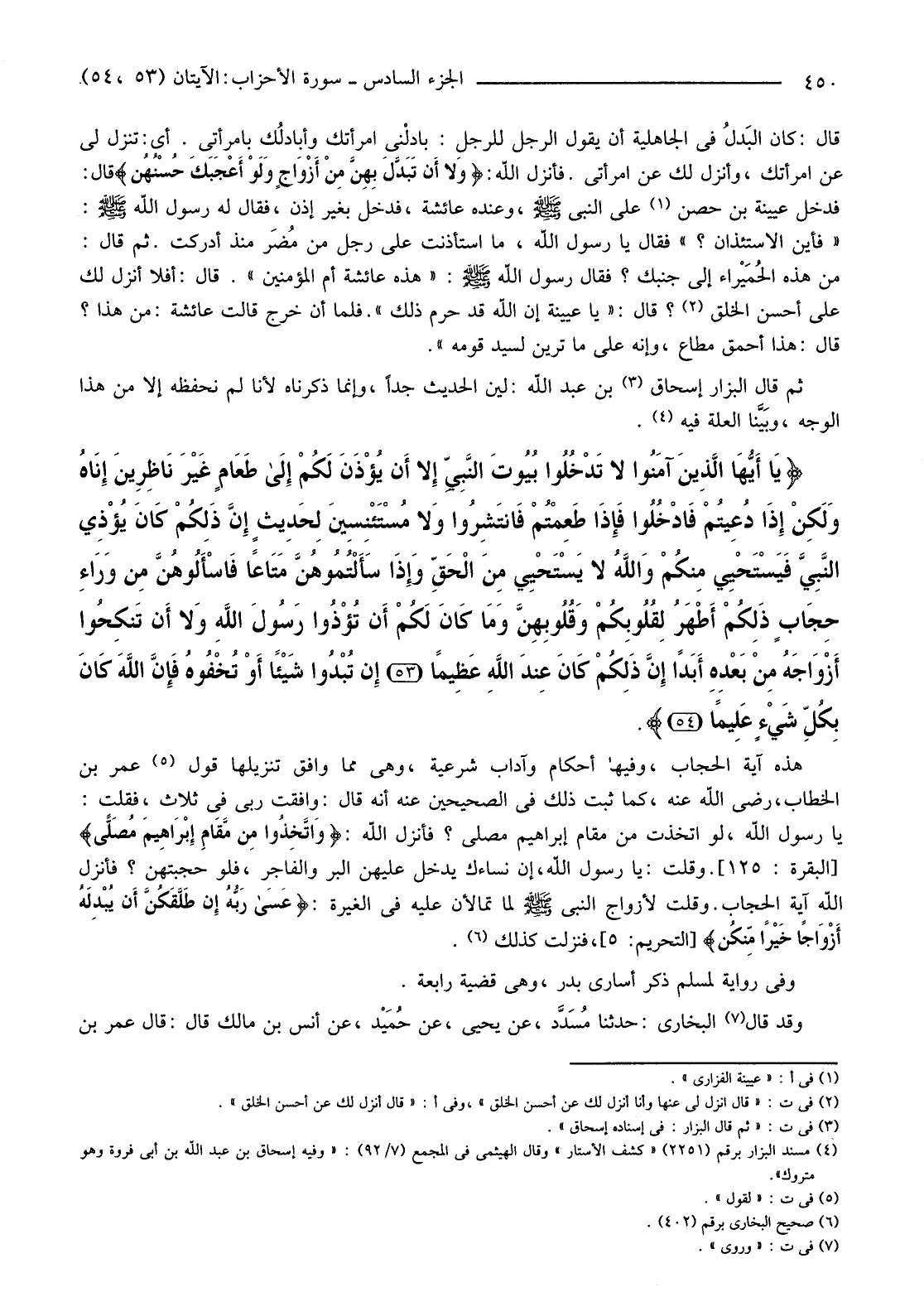 {يَا أَيُّهَا الَّذِينَ آمَنُوا لَا تَدْخُلُوا بُيُوتَ النَّبِيِّ إِلا أَنْ يُؤْذَنَ لَكُمْ إِلَى طَعَامٍ غَيْرَ نَاظِرِينَ إِنَاهُ وَلَكِنْ إِذَا دُعِيتُمْ فَادْخُلُوا فَإِذَا طَعِمْتُمْ فَانْتَشِرُوا وَلا مُسْتَأْنِسِينَ لِحَدِيثٍ إِنَّ ذَلِكُمْ كَانَ يُؤْذِي النَّبِيَّ فَيَسْتَحْيِي مِنْكُمْ وَاللَّهُ لَا يَسْتَحْيِي مِنَ الْحَقِّ وَإِذَا سَأَلْتُمُوهُنَّ مَتَاعًا فَاسْأَلُوهُنَّ مِنْ وَرَاءِ حِجَابٍ ذَلِكُمْ أَطْهَرُ لِقُلُوبِكُمْ وَقُلُوبِهِنَّ وَمَا كَانَ لَكُمْ أَنْ تُؤْذُوا رَسُولَ اللَّهِ وَلا أَنْ تَنْكِحُوا أَزْوَاجَهُ مِنْ بَعْدِهِ أَبَدًا إِنَّ ذَلِكُمْ كَانَ عِنْدَ اللَّهِ عَظِيمًا (53) إِنْ تُبْدُوا شَيْئًا أَوْ تُخْفُوهُ فَإِنَّ اللَّهَ كَانَ بِكُلِّ شَيْءٍ عَلِيمًا (54) } .