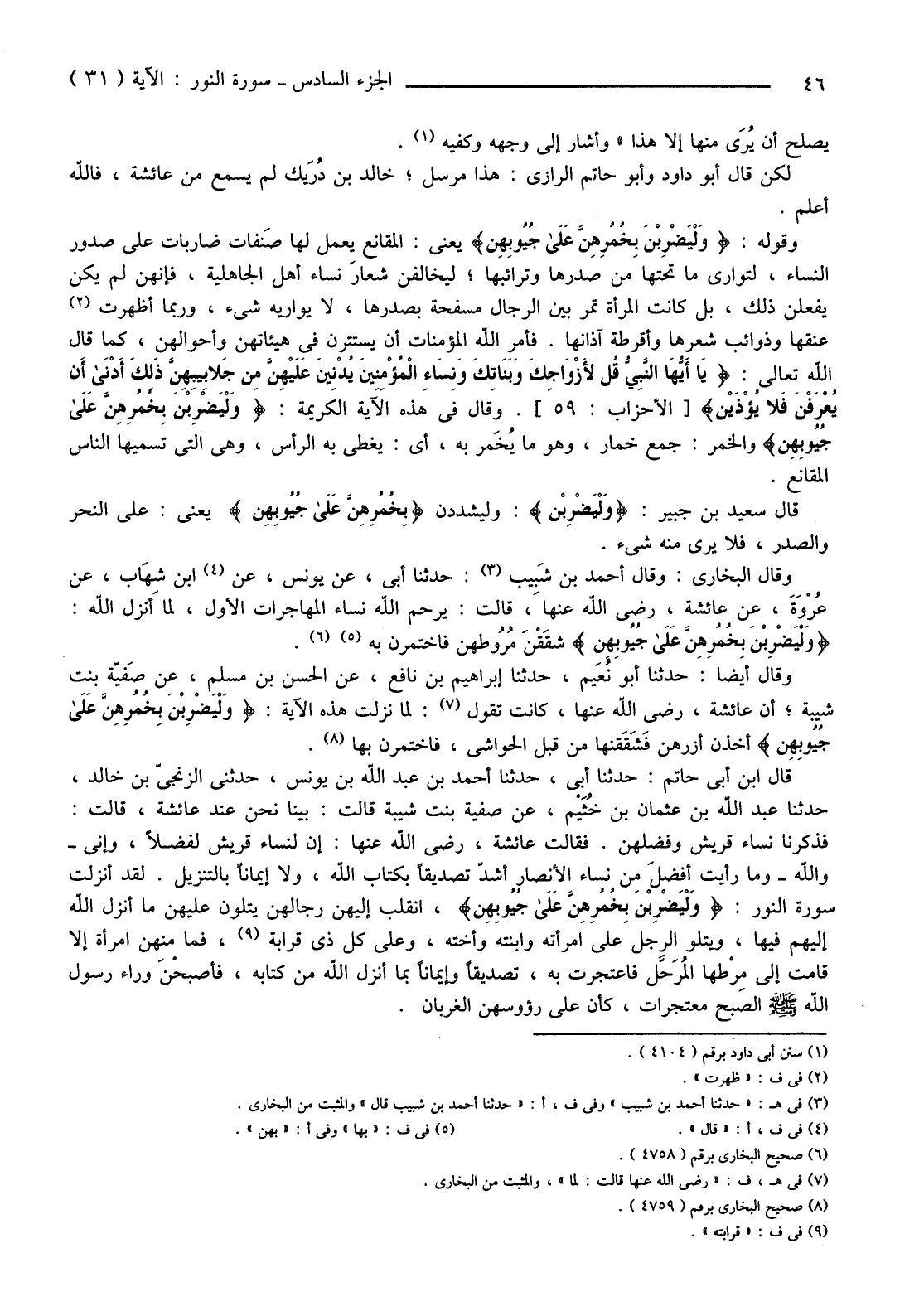 وَقَالَ ابْنُ أَبِي حَاتِمٍ: حَدَّثَنَا أَبِي، حَدَّثَنَا أَحْمَدُ بْنُ عَبْدِ اللَّهِ بْنِ يُونُسَ، حَدَّثَنِي الزِّنْجِيُّ بْنُ خَالِدٍ، حَدَّثَنَا عَبْدُ اللَّهِ بْنُ عُثْمَانَ بْنِ خُثَيْم، عَنْ صَفِيَّةَ بِنْتِ شَيْبَةَ قَالَتْ: بَيْنَا نَحْنُ عِنْدَ عَائِشَةَ، قَالَتْ: فَذَكَرْنَا نِسَاءَ قُرَيْشٍ وَفَضْلَهُنَّ. فَقَالَتْ عَائِشَةُ، رَضِيَ اللَّهُ عَنْهَا: إِنَّ لِنِسَاءِ قُرَيْشٍ لَفَضْلًا وَإِنِّي -وَاللَّهِ -وَمَا رَأَيْتُ أفضلَ مِنْ نِسَاءِ الْأَنْصَارِ أَشَدَّ تَصْدِيقًا بِكِتَابِ اللَّهِ، وَلَا إِيمَانًا بِالتَّنْزِيلِ. لَقَدْ أُنْزِلَتْ سُورَةُ النُّورِ: {وَلْيَضْرِبْنَ بِخُمُرِهِنَّ عَلَى جُيُوبِهِنَّ} ، انْقَلَبَ إِلَيْهِنَّ رِجَالُهُنَّ يَتْلُونَ عَلَيْهِنَّ مَا أَنْزَلَ اللَّهُ إِلَيْهِمْ فِيهَا، وَيَتْلُو الرَّجُلُ عَلَى امْرَأَتِهِ وَابْنَتِهِ وَأُخْتِهِ، وَعَلَى كُلِّ ذِي قَرَابَةٍ (9) ، فَمَا مِنْهُنَّ امْرَأَةٌ إِلَّا قَامَتْ إِلَى مِرْطها المُرَحَّل فَاعْتَجَرَتْ بِهِ، تَصْدِيقًا وَإِيمَانًا بِمَا أَنْزَلَ اللَّهُ مِنْ كِتَابِهِ، فأصبحْنَ وَرَاءَ رَسُولِ اللَّهِ صَلَّى اللَّهُ عَلَيْهِ وَسَلَّمَ الصُّبْحَ مُعْتَجَرَاتٍ، كأن على رؤوسهن الغربان.