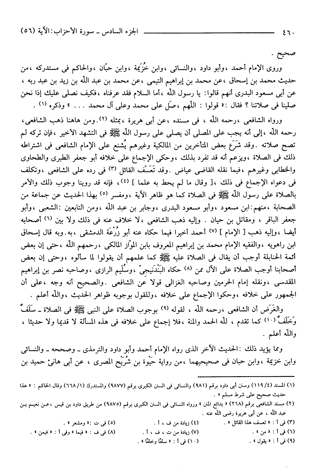 وَرَوَاهُ الشَّافِعِيُّ، رَحِمَهُ اللَّهُ، فِي مُسْنَدِهِ، عَنْ أَبِي هُرَيْرَةَ، بِمِثْلِهِ (2) . وَمِنْ هَاهُنَا ذَهَبَ الشَّافِعِيُّ، رَحِمَهُ اللَّهُ، إِلَى أَنَّهُ يَجِبُ عَلَى الْمُصَلِّي أَنْ يُصَلِّيَ عَلَى رَسُولِ اللَّهِ صَلَّى اللَّهُ عَلَيْهِ وَسَلَّمَ فِي التَّشَهُّدِ الْأَخِيرِ، فَإِنْ تَرَكَهُ لَمْ تَصِحَّ صَلَاتُهُ. وَقَدْ شَرَع بَعْضُ الْمُتَأَخِّرِينَ مِنَ الْمَالِكِيَّةِ وَغَيْرِهِمْ يُشنع عَلَى الْإِمَامِ الشَّافِعِيِّ فِي اشْتِرَاطِهِ ذَلِكَ فِي الصَّلَاةِ، وَيَزْعُمُ أَنَّهُ قَدْ تَفَرَّدَ بِذَلِكَ، وَحَكَى الْإِجْمَاعَ عَلَى خِلَافِهِ أَبُو جَعْفَرٍ الطَّبَرِيُّ وَالطَّحَاوِيُّ وَالْخَطَّابِيُّ وَغَيْرُهُمْ، فِيمَا نَقَلَهُ الْقَاضِي عِيَاضٌ. وَقَدْ تَعَسّف الْقَائِلُ (3) فِي رَدِّهِ عَلَى الشَّافِعِيِّ، وَتَكَلَّفَ فِي دَعْوَاهُ الْإِجْمَاعَ فِي ذَلِكَ، [وَقَالَ مَا لَمْ يُحِطْ بِهِ عِلْمًا] (4) ، فَإِنَّهُ قَدْ رَوَيْنَا وُجُوبَ ذَلِكَ وَالْأَمْرَ بِالصَّلَاةِ عَلَى رَسُولِ اللَّهِ صَلَّى اللَّهُ عَلَيْهِ وَسَلَّمَ فِي الصَّلَاةِ كَمَا هُوَ ظَاهِرُ الْآيَةِ، وَمُفَسَّرٌ (5) بِهَذَا الْحَدِيثِ عَنْ جَمَاعَةٍ مِنَ الصَّحَابَةِ، مِنْهُمْ: ابْنُ مَسْعُودٍ، وَأَبُو مَسْعُودٍ الْبَدْرِيُّ، وَجَابِرُ بْنُ عَبْدِ اللَّهِ، وَمِنَ التَّابِعِينَ: الشَّعْبِيُّ، وَأَبُو جَعْفَرٍ الْبَاقِرُ، وَمُقَاتِلُ بْنُ حَيَّانَ. وَإِلَيْهِ ذَهَبَ الشَّافِعِيُّ، لَا خِلَافَ عَنْهُ فِي ذَلِكَ وَلَا بَيْنَ (6) أَصْحَابِهِ أَيْضًا، وَإِلَيْهِ ذَهَبَ [الْإِمَامُ] (7) أَحْمَدُ أَخِيرًا فِيمَا حَكَاهُ عَنْهُ أَبُو زُرْعَة الدمشقي، به. وبه قال إسحاق بن رَاهْوَيْهِ، وَالْفَقِيهُ الْإِمَامُ مُحَمَّدُ بْنُ إِبْرَاهِيمَ الْمَعْرُوفُ بِابْنِ الْمَوَّازِ الْمَالِكِيُّ، رَحِمَهُمُ اللَّهُ، حَتَّى إِنَّ بَعْضَ أَئِمَّةِ الْحَنَابِلَةِ أَوْجَبَ أَنْ يُقَالَ فِي الصَّلَاةِ عَلَيْهِ صَلَّى اللَّهُ عَلَيْهِ وَسَلَّمَ كَمَا عَلَّمَهُمْ أَنْ يَقُولُوا لَمَّا سَأَلُوهُ، وَحَتَّى إِنَّ بَعْضَ أَصْحَابِنَا أَوْجَبَ الصَّلَاةَ عَلَى الْآلِ مِمَّنْ (8) حَكَاهُ البَنْدَنيجِيّ، وسُلَيم الرَّازِّيُّ، وَصَاحِبُهُ نَصْرُ بْنُ إِبْرَاهِيمَ الْمَقْدِسِيُّ، وَنَقَلَهُ إِمَامُ الْحَرَمَيْنِ وَصَاحِبُهُ الْغَزَالِيُّ قَوْلًا عَنِ الشَّافِعِيِّ. وَالصَّحِيحُ أَنَّهُ وَجْهٌ، عَلَى أَنَّ الْجُمْهُورَ عَلَى خِلَافِهِ، وَحَكَوُا الْإِجْمَاعَ عَلَى خِلَافِهِ، وَلِلْقَوْلِ بِوُجُوبِهِ ظَوَاهِرُ الْحَدِيثِ، وَاللَّهُ أَعْلَمُ.