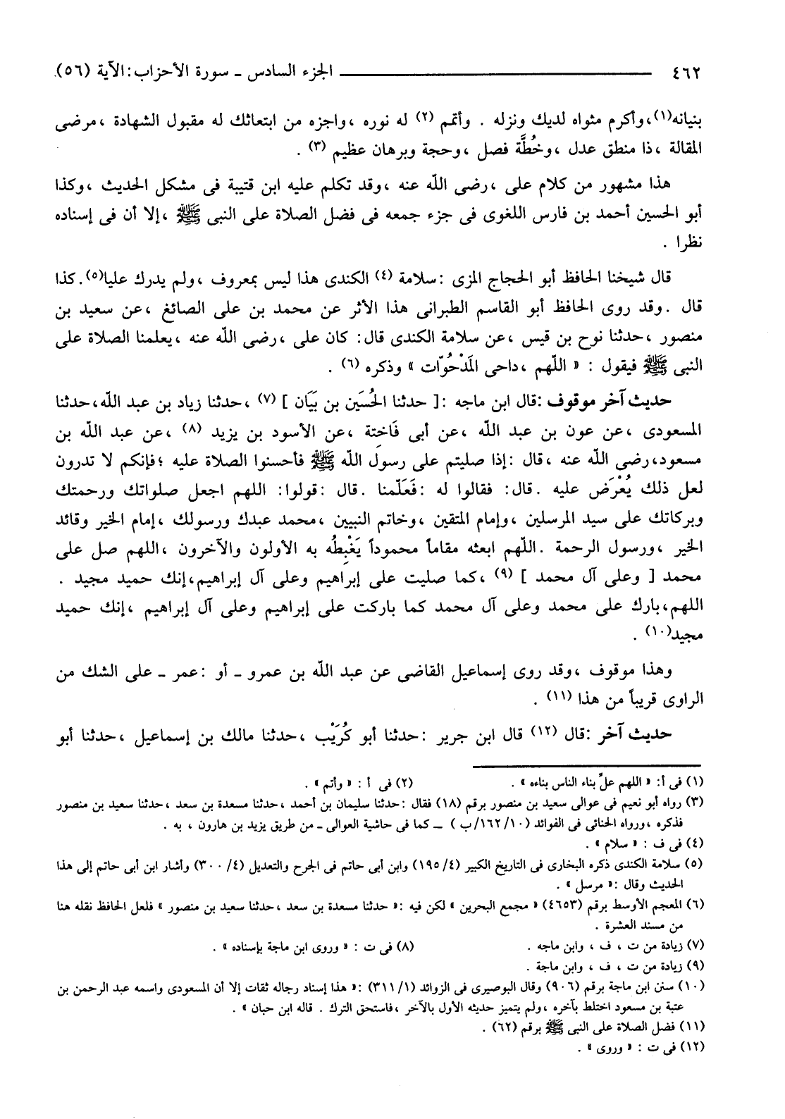 حَدِيثٌ آخَرُ مَوْقُوفٌ: قَالَ ابْنُ مَاجَهْ: [حَدَّثَنَا الحُسَين بْنُ بَيَان] (7) ، حَدَّثَنَا زِيَادُ بْنُ عَبْدِ اللَّهِ، حَدَّثَنَا الْمَسْعُودِيِّ، عَنْ عَوْنِ بْنِ عَبْدِ اللَّهِ، عَنْ أَبِي فَاخِتة، عَنِ الْأُسُودِ بْنِ يَزِيدَ (8) ، عَنْ عَبْدِ اللَّهِ بْنِ مَسْعُودٍ، رَضِيَ اللَّهُ عَنْهُ، قَالَ: إِذَا صَلَّيْتُمْ عَلَى رَسُولِ اللَّهِ صَلَّى اللَّهُ عَلَيْهِ وَسَلَّمَ فَأَحْسِنُوا الصَّلَاةَ عَلَيْهِ؛ فَإِنَّكُمْ لَا تَدْرُونَ لَعَلَّ ذَلِكَ يُعْرَض عَلَيْهِ. قَالَ: فَقَالُوا لَهُ: فَعَلّمنا. قَالَ: قُولُوا: اللَّهُمَّ اجْعَلْ صَلَوَاتِكَ وَرَحْمَتَكَ وَبَرَكَاتِكَ عَلَى سَيِّدِ الْمُرْسَلِينَ، وَإِمَامِ الْمُتَّقِينَ، وَخَاتَمِ النَّبِيِّينَ، مُحَمَّدٍ عَبْدِكَ وَرَسُولِكَ، إِمَامِ الْخَيْرِ وَقَائِدِ الْخَيْرِ، وَرَسُولِ الرَّحْمَةِ. اللَّهُمَّ ابْعَثْهُ مَقَامًا مَحْمُودًا يَغْبِطُه بِهِ الْأَوَّلُونَ وَالْآخَرُونَ، اللَّهُمَّ صِلِّ عَلَى مُحَمَّدٍ [وَعَلَى آلِ مُحَمَّدٍ] (9) ، كَمَا صَلَّيْتَ عَلَى إِبْرَاهِيمَ وَعَلَى آلِ إِبْرَاهِيمَ، إِنَّكَ حَمِيدٌ مَجِيدٌ، اللَّهُمَّ بَارِكْ عَلَى مُحَمَّدٍ وَعَلَى آلِ مُحَمَّدٍ كَمَا بَارَكْتَ عَلَى إِبْرَاهِيمَ وَعَلَى آلِ إِبْرَاهِيمَ إِنَّكَ حَمِيدٌ مَجِيدٌ. (10)