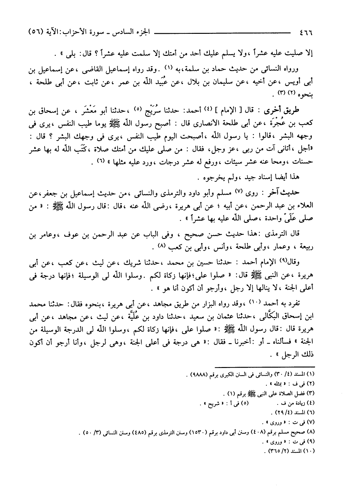 حَدِيثٌ آخَرُ: رَوَى (7) مُسْلِمٌ وَأَبُو دَاوُدَ وَالتِّرْمِذِيُّ وَالنَّسَائِيُّ، مِنْ حَدِيثِ إِسْمَاعِيلَ بْنِ جَعْفَرٍ، عَنِ الْعَلَاءِ بْنِ عَبْدِ الرَّحْمَنِ، عَنْ أَبِيهِ؛ عَنْ أَبِي هُرَيْرَةَ، رَضِيَ اللَّهُ عَنْهُ، قَالَ: قَالَ رَسُولُ اللَّهِ صَلَّى اللَّهُ عَلَيْهِ وَسَلَّمَ: "مَنْ صَلَّى عَلَيّ وَاحِدَةً، صَلَّى اللَّهُ عَلَيْهِ بِهَا عَشْرًا".