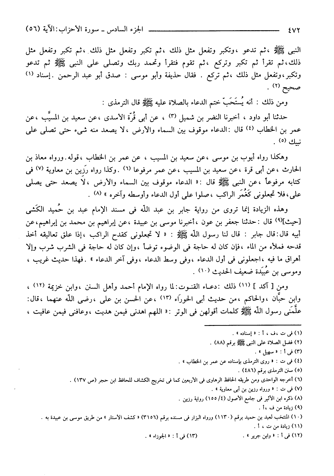 النَّبِيِّ صَلَّى اللَّهُ عَلَيْهِ وَسَلَّمَ ثُمَّ تَدْعُو، وَتُكَبِّرُ وَتَفْعَلُ مِثْلَ ذَلِكَ، ثُمَّ تُكَبِّرُ وَتَفْعَلُ مِثْلَ ذَلِكَ، ثُمَّ تُكَبِّرُ وَتَفْعَلُ مِثْلَ ذَلِكَ، ثُمَّ تَقْرَأُ، ثُمَّ تُكَبِّرُ وَتَرْكَعُ، ثُمَّ تَقُومُ فَتَقْرَأُ وَتَحْمَدُ رَبَّكَ وَتُصَلِّي عَلَى النَّبِيِّ صَلَّى اللَّهُ عَلَيْهِ وَسَلَّمَ ثُمَّ تَدْعُو وَتُكَبِّرُ، وَتَفْعَلُ مِثْلَ ذَلِكَ، ثُمَّ تَرْكَعُ. فَقَالَ حُذَيْفَةُ وَأَبُو مُوسَى: صَدَقَ أَبُو عَبْدِ الرَّحْمَنِ. إِسْنَادٌ (1) صَحِيحٌ (2)