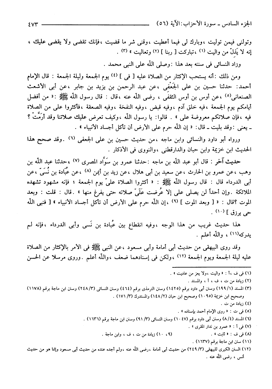 وَمِنْ ذَلِكَ: أَنَّهُ يُسْتَحَبُّ الْإِكْثَارُ مِنَ الصَّلَاةِ عَلَيْهِ [فِي] (4) يَوْمِ الْجُمُعَةِ وَلَيْلَةِ الْجُمُعَةِ: قَالَ الْإِمَامُ أَحْمَدُ: حَدَّثَنَا حُسَيْنُ بْنُ عَلِيٍّ الجَعْفِي، عَنْ عَبْدِ الرَّحْمَنِ بْنِ يَزِيدَ بْنِ جَابِرٍ، عَنْ أَبِي الْأَشْعَثِ الصَّنْعَانِيِّ (5) ، عَنْ أَوْسِ بْنِ أَوْسٍ الثَّقَفِيِّ، رَضِيَ اللَّهُ عَنْهُ، قَالَ: قَالَ رَسُولُ اللَّهِ صلى الله عليه وسلم: "من أَفْضَلِ أَيَّامِكُمْ يَوْمُ الْجُمُعَةِ، فِيهِ خُلِقَ آدَمُ، وَفِيهِ قُبِضَ، وَفِيهِ النَّفْخَةُ، وَفِيهِ الصَّعْقَةُ، فَأَكْثِرُوا عَلَيَّ مِنَ الصَّلَاةِ فِيهِ، فَإِنَّ صَلَاتَكُمْ مَعْرُوضَةٌ عَلَيَّ". قَالُوا: يَا رَسُولَ اللَّهِ، وَكَيْفَ تُعْرَضُ عَلَيْكَ صَلَاتُنَا وَقَدْ أرمتْ؟ -يَعْنِي: وَقَدْ بَلِيتَ -قَالَ: "إِنَّ اللَّهَ حَرَّمَ عَلَى الْأَرْضِ أَنْ تَأْكُلَ أَجْسَادَ الْأَنْبِيَاءِ".