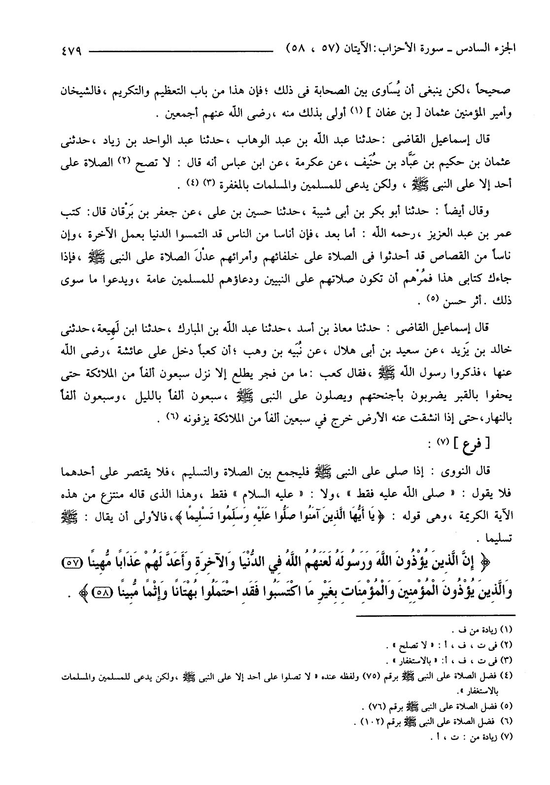 (4) فضل الصلاة على النبي صلى الله عليه وسلم برقم (75) ولفظه عنده "لا تصلوا عَلَى أَحَدٍ إِلَّا عَلَى النَّبِيِّ صَلَّى اللَّهُ عليه وسلم، ولكن يدعى للمسلمين والمسلمات بالاستغفار".