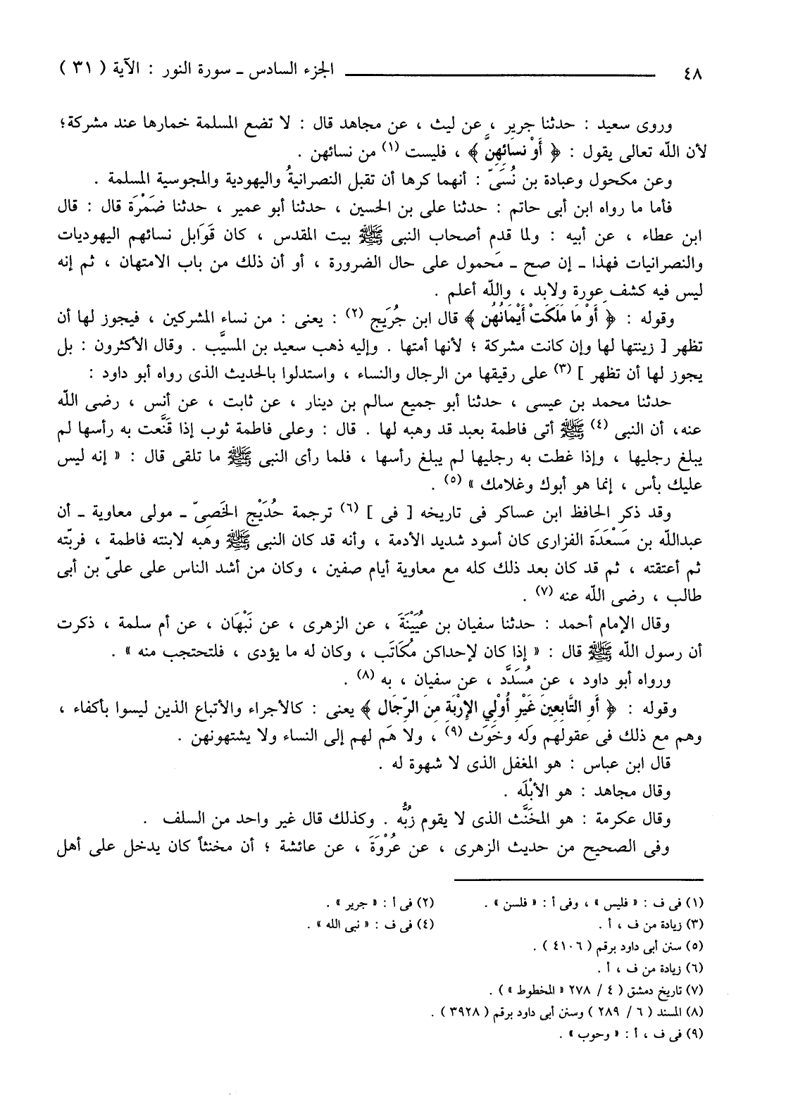 وَقَوْلُهُ: {أَوْ مَا مَلَكَتْ أَيْمَانُهُنَّ} قَالَ ابْنُ جُرَيج (2) : يَعْنِي: مِنْ نِسَاءِ الْمُشْرِكِينَ، فَيَجُوزُ لَهَا أَنْ تُظْهِرَ [زَينَتَهَا لَهَا وَإِنْ كَانَتْ مُشْرِكَةً؛ لِأَنَّهَا أَمَتُهَا. وَإِلَيْهِ ذَهَبَ سَعِيدُ بْنُ المسيَّب. وَقَالَ الْأَكْثَرُونَ: بَلْ يَجُوزُ لَهَا أَنْ تَظْهَرَ] (3) عَلَى رَقِيقِهَا مِنَ الرِّجَالِ وَالنِّسَاءِ، وَاسْتَدَلُّوا بِالْحَدِيثِ الَّذِي رَوَاهُ أَبُو دَاوُدَ: