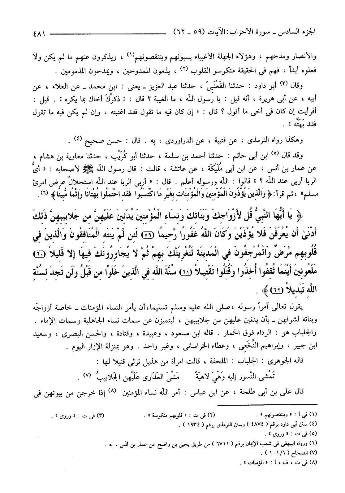 {يَا أَيُّهَا النَّبِيُّ قُلْ لأزْوَاجِكَ وَبَنَاتِكَ وَنِسَاءِ الْمُؤْمِنِينَ يُدْنِينَ عَلَيْهِنَّ مِنْ جَلابِيبِهِنَّ ذَلِكَ أَدْنَى أَنْ يُعْرَفْنَ فَلا يُؤْذَيْنَ وَكَانَ اللَّهُ غَفُورًا رَحِيمًا (59) لَئِنْ لَمْ يَنْتَهِ الْمُنَافِقُونَ وَالَّذِينَ فِي قُلُوبِهِمْ مَرَضٌ وَالْمُرْجِفُونَ فِي الْمَدِينَةِ لَنُغْرِيَنَّكَ بِهِمْ ثُمَّ لَا يُجَاوِرُونَكَ فِيهَا إِلا قَلِيلا (60) مَلْعُونِينَ أَيْنَمَا ثُقِفُوا أُخِذُوا وَقُتِّلُوا تَقْتِيلا (61) سُنَّةَ اللَّهِ فِي الَّذِينَ خَلَوْا مِنْ قَبْلُ وَلَنْ تَجِدَ لِسُنَّةِ اللَّهِ تَبْدِيلا (62) } .