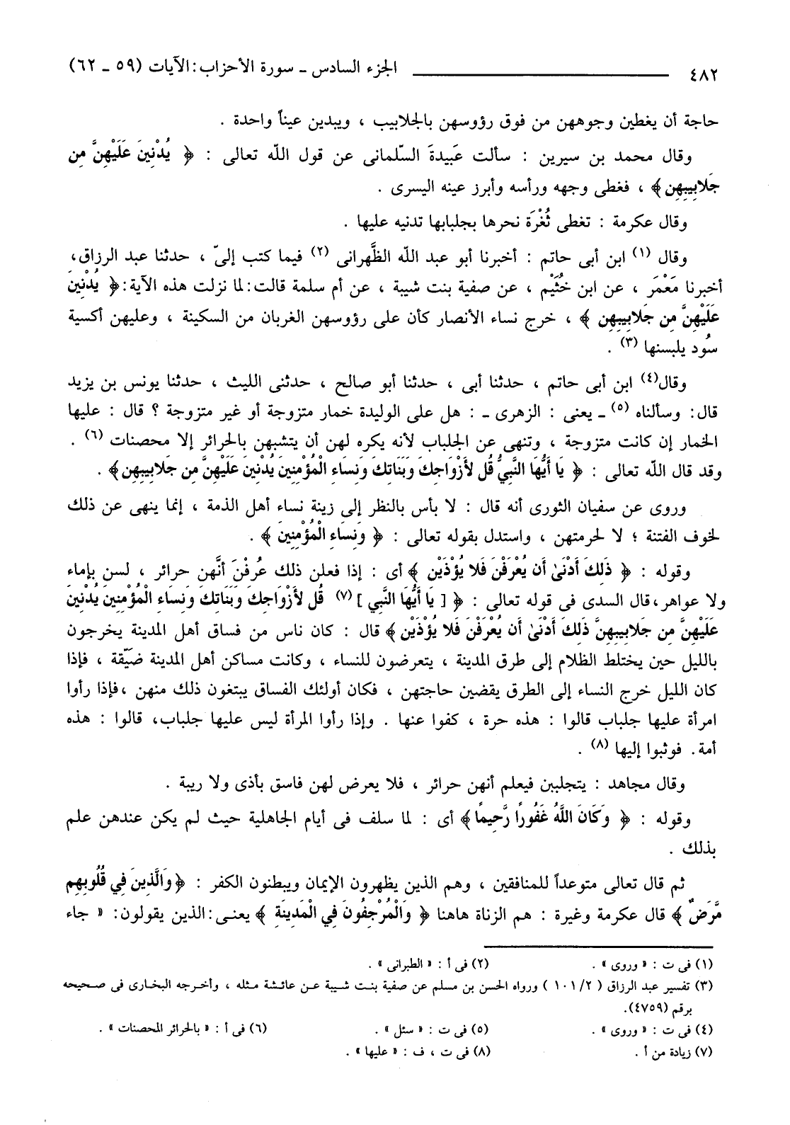 وَقَالَ مُحَمَّدِ بْنِ سِيرِينَ: سَأَلْتُ عَبيدةَ السَّلْمَانِيَّ عَنْ قَوْلِ اللَّهِ تَعَالَى: {يُدْنِينَ عَلَيْهِنَّ مِنْ جَلابِيبِهِنَّ} ، فَغَطَّى وَجْهَهُ وَرَأْسَهُ وَأَبْرَزَ عَيْنَهُ الْيُسْرَى.